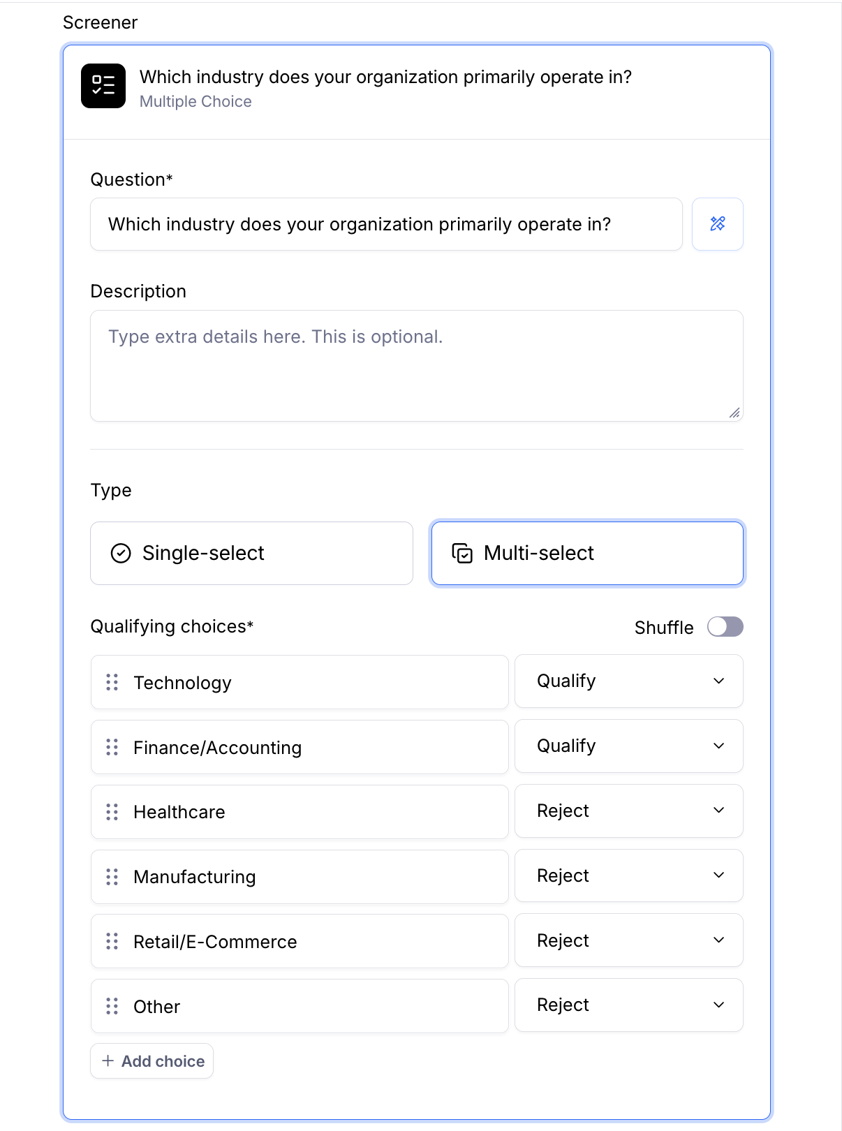 Each screening question can be single-select or multi-select. In single-select questions, each answer can either qualify or disqualify the participant.