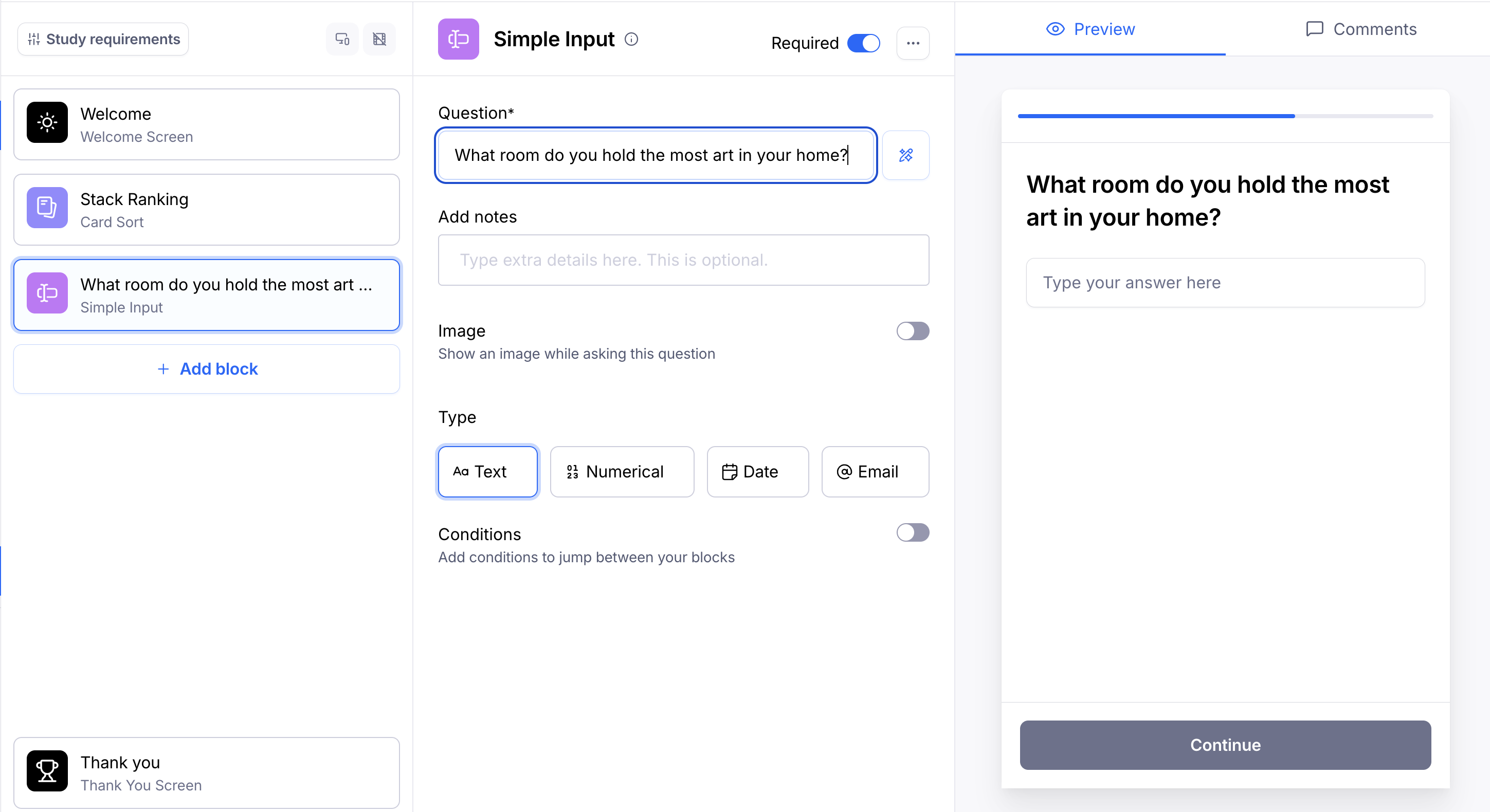 - Choose the answer type you want to collect: Text, Numerical, Date, or Email.