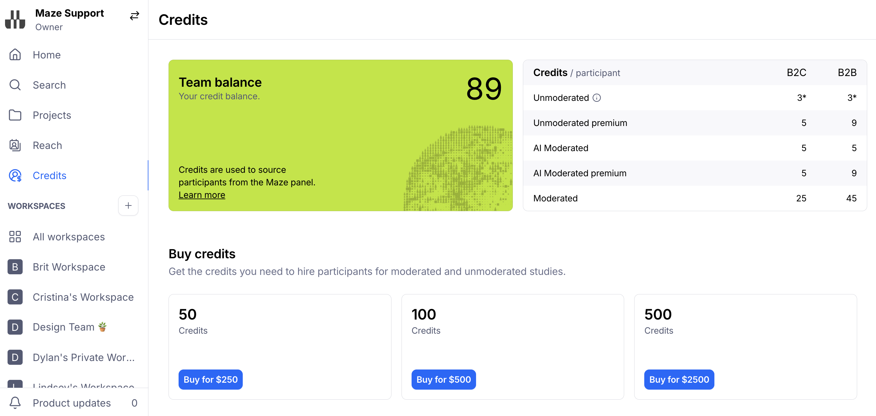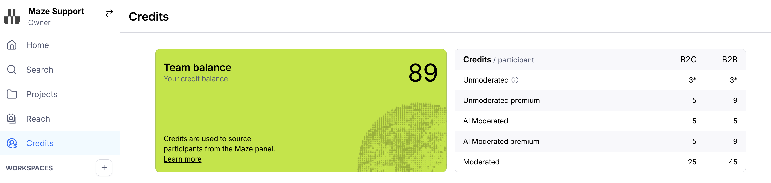 Credits are the currency used on Maze to recruit panel participants. Each panel response has a credit value, which varies depending on the study type and the targeting criteria.