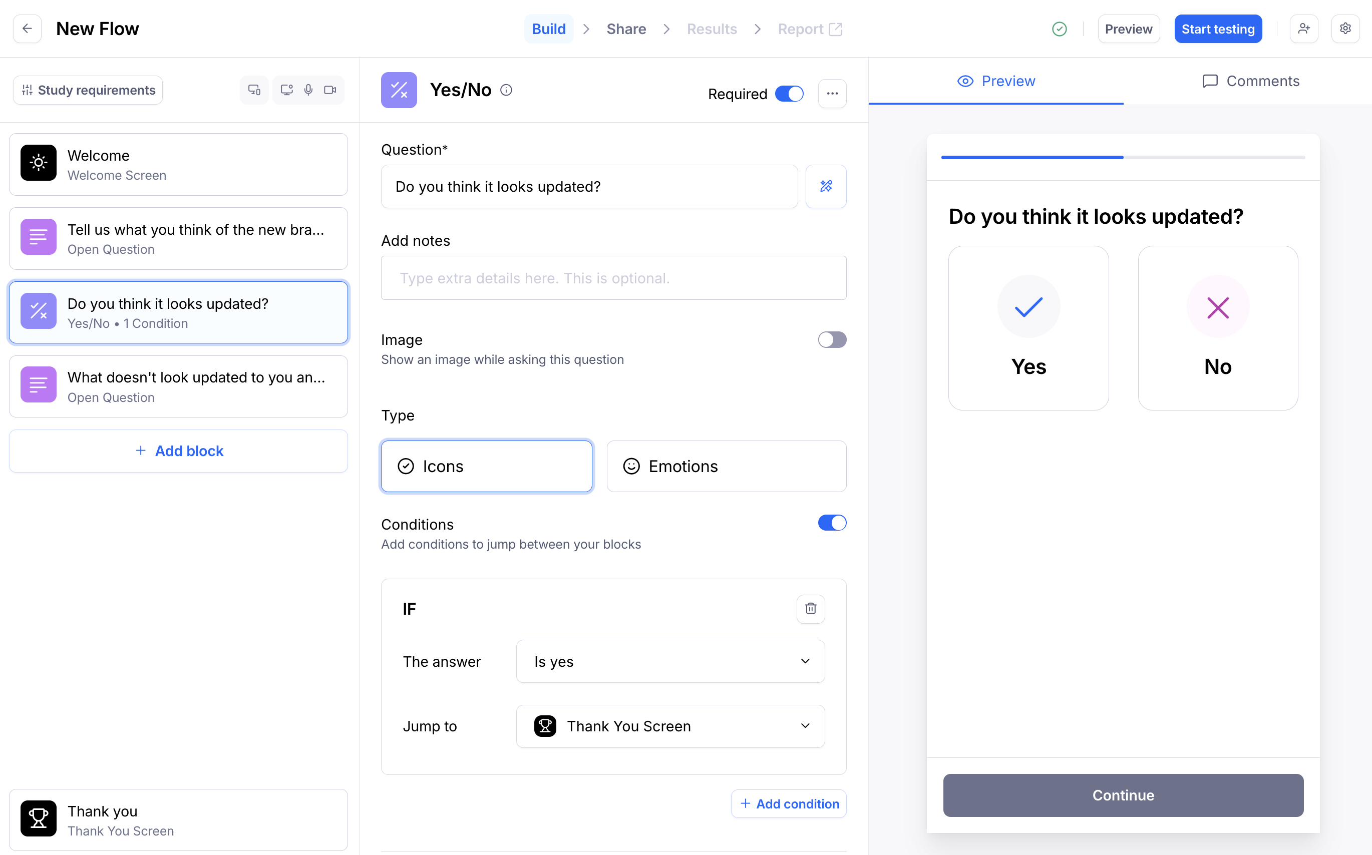 Based on the outcome of a mission, or on the answer a tester gives you, you can direct them to different blocks. This lets you ask clarifying questions or get targeted feedback only when necessary to help reduce the length of your test.
