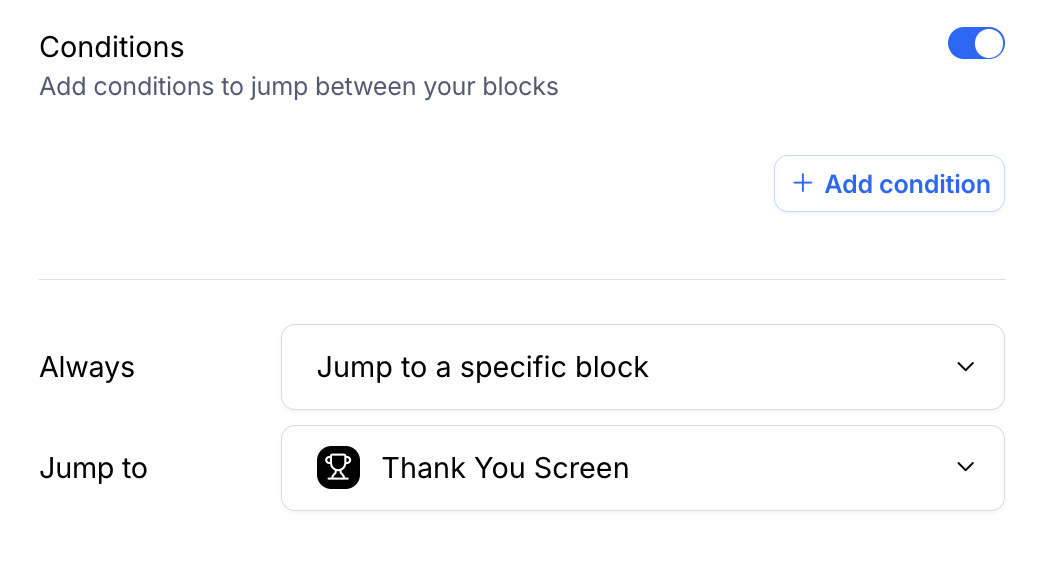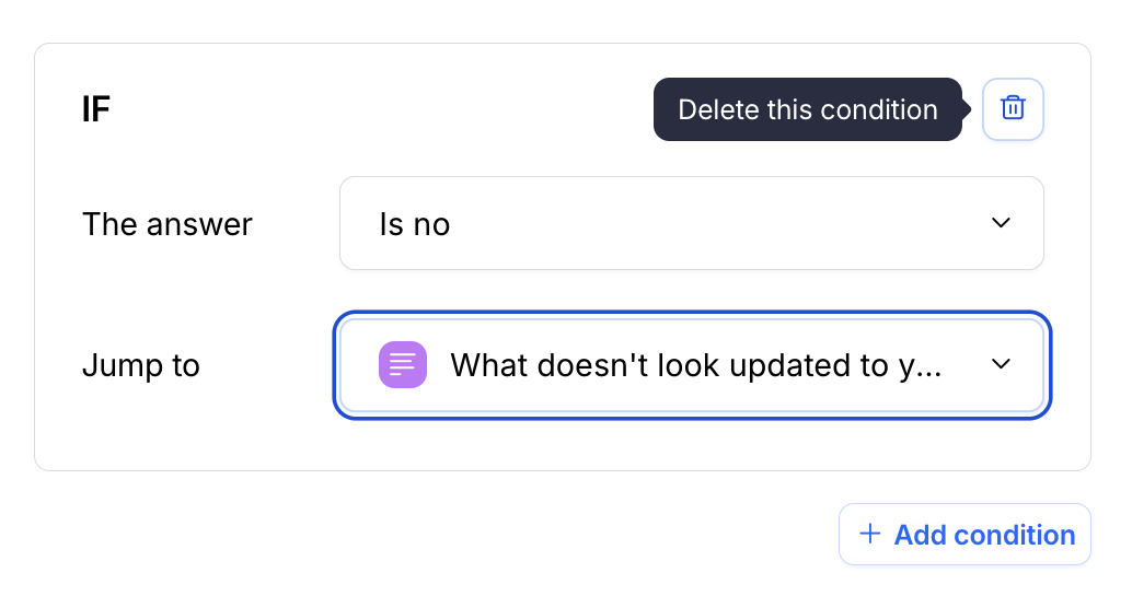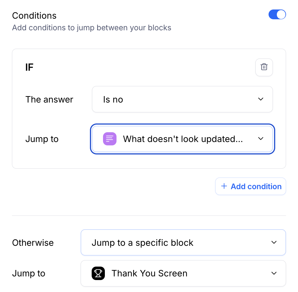 Be sure to add an Always condition to the subsequent blocks that you’re using as a follow-up to your conditions. This ensures that questions that aren’t relevant to that path are correctly skipped in the logic. Learn more in the section below: Add “Always” conditions in complex branching - If needed, you can click Add Condition to specify additional conditional criteria, allowing for complex routing.