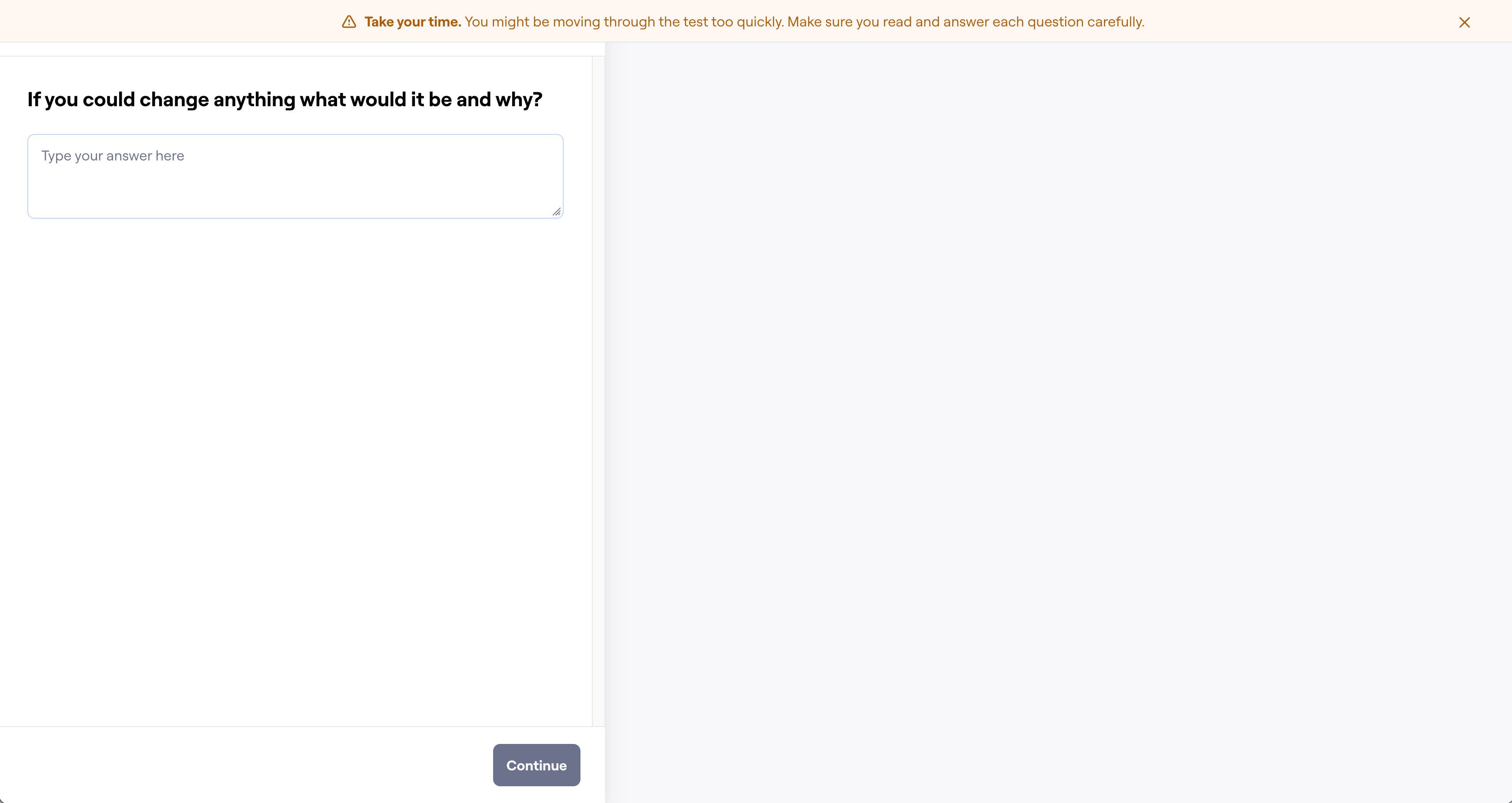 - If someone completes sections in less than 10% of the expected time, they’ll see a prompt encouraging them to slow down and provide thoughtful responses.