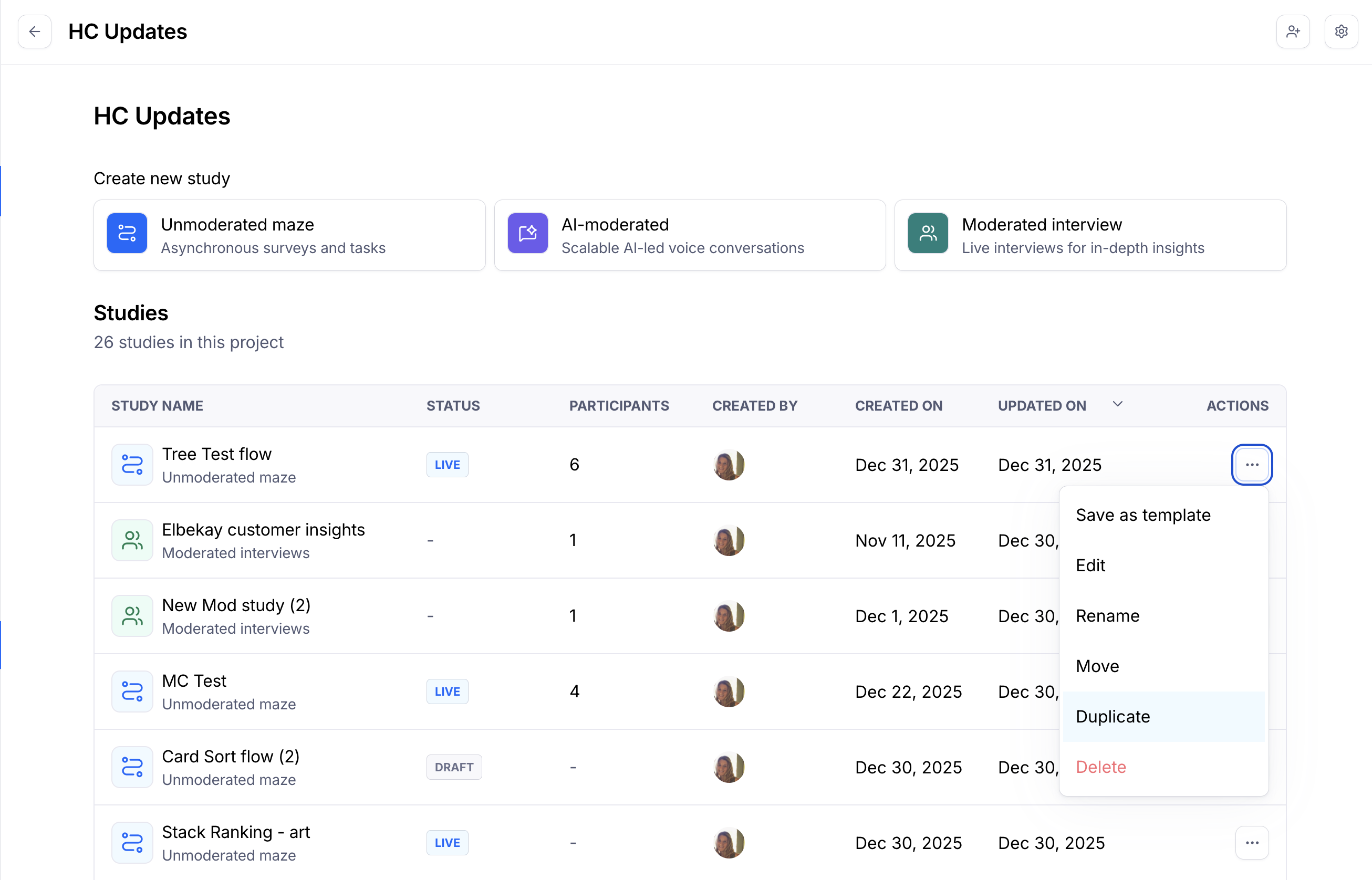 To create a duplicate copy of a study, from your Projects page, hover over the study you want to duplicate and click Duplicate.