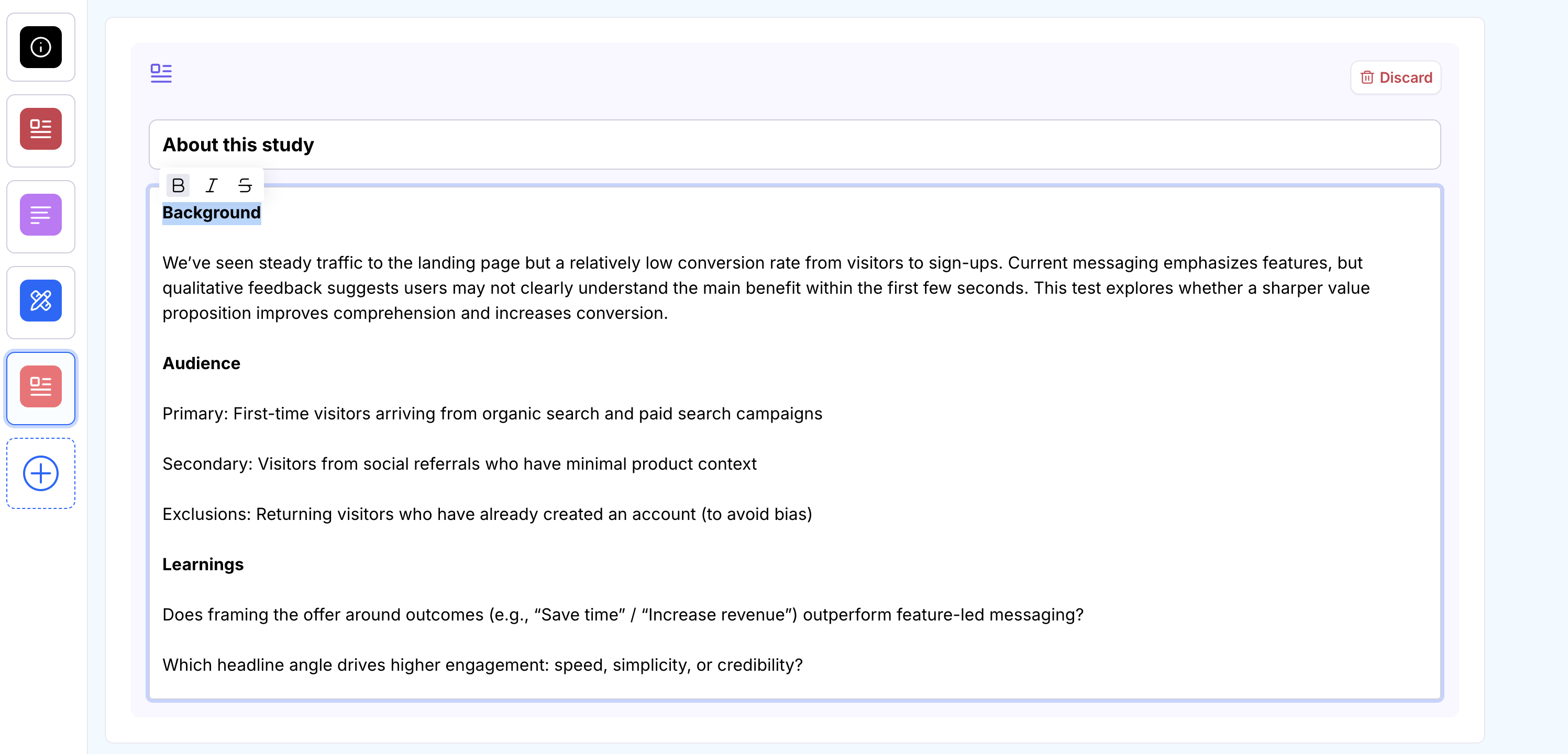 At the beginning of each block, you can include a custom section. This can be useful to highlight key findings and share hypotheses related to that particular block.