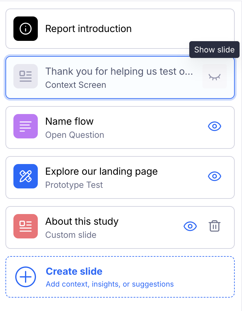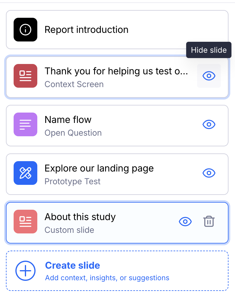 - Click Hide slide next to each slide in the list. Hidden slides are only visible during report editing.