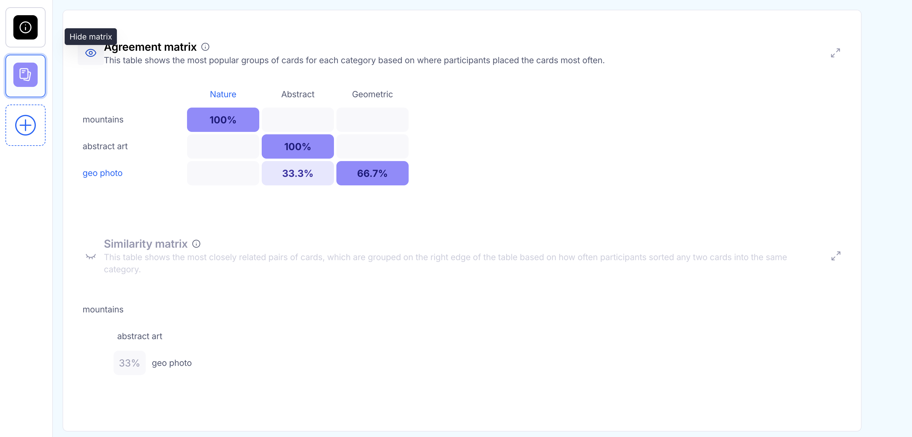 Show/hide the agreement and similarity matrix in card sorting blocks