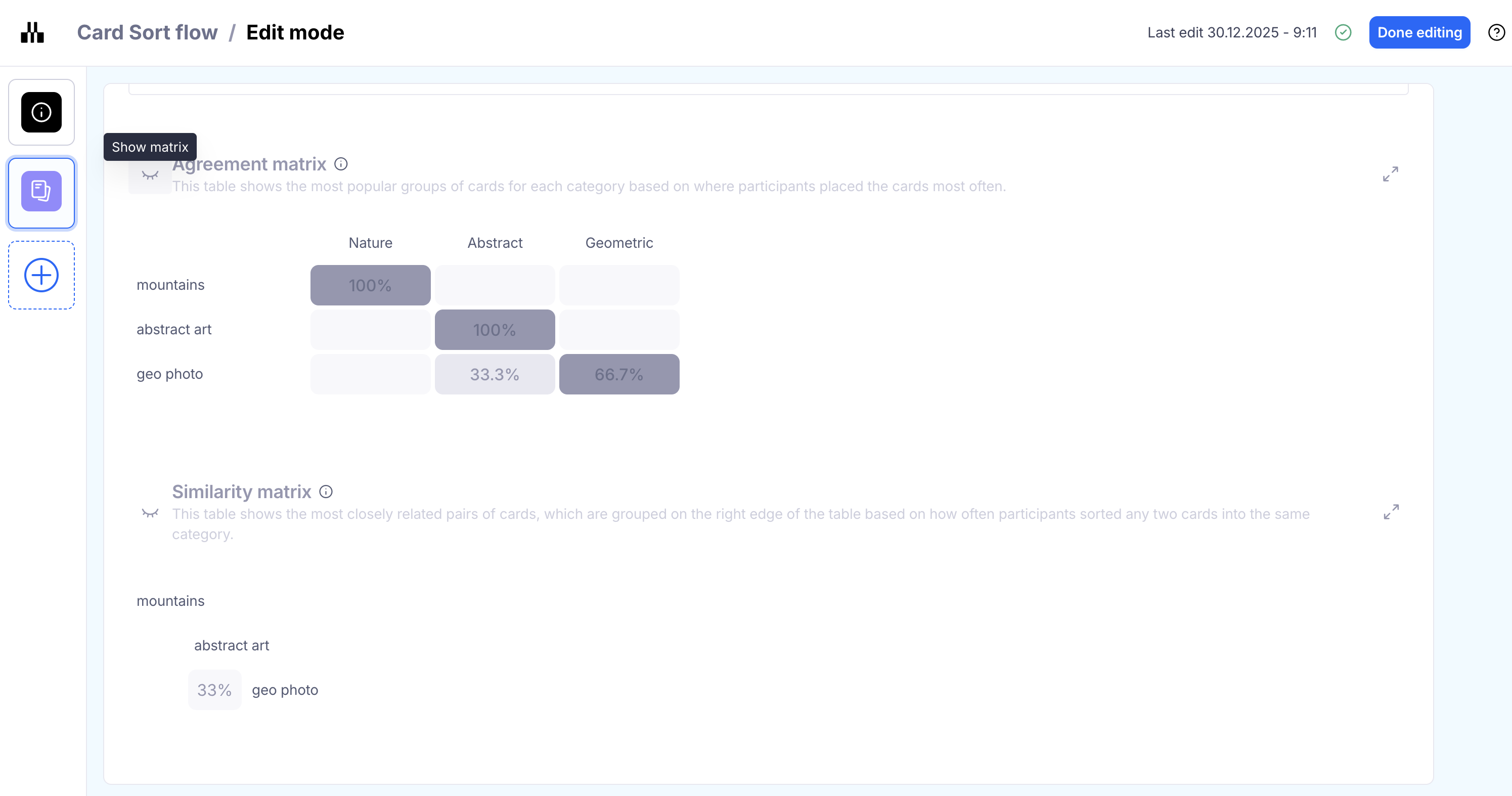 - Show/hide the agreement and similarity matrix in card sorting blocks