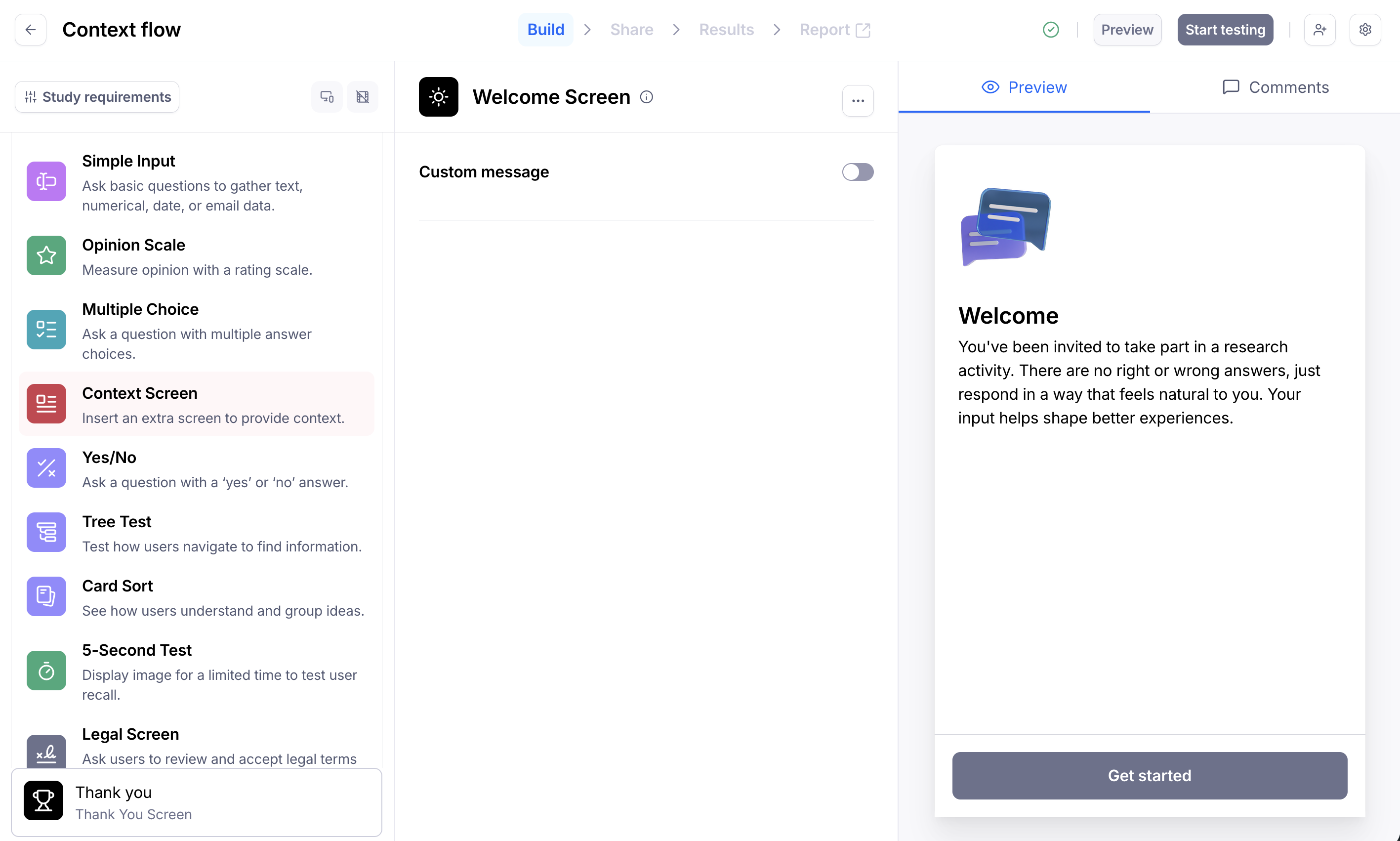 - Before missions: You can also use a Context Screen to introduce prototype or website testing and what you expect participants to do. This could be helpful for novice testers.