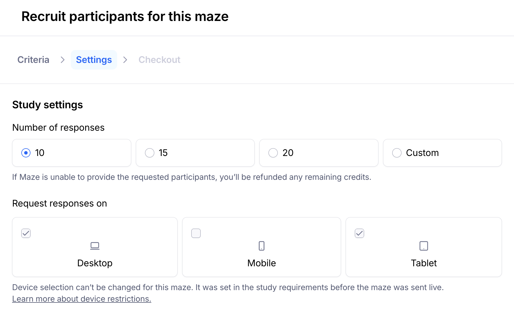 Device settings determine which devices (desktop, tablet, mobile, or all) participants can use to complete your unmoderated study.