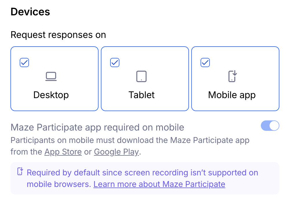 This guide explains how to configure device settings for unmoderated studies, with a special focus on our new mobile app capabilities. Understanding these settings is crucial for researchers to ensure participants can properly access and complete studies on their intended devices.