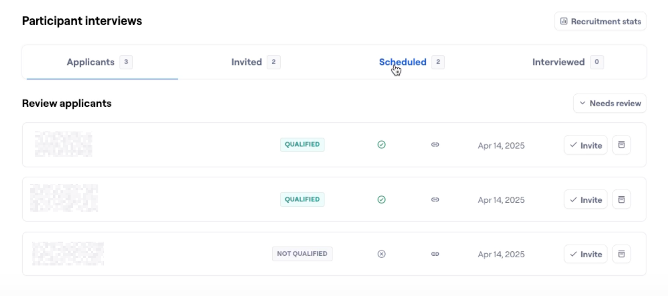 Participants who apply through the recruitment link must be manually reviewed and invited. Regardless of how screener questions are answered, you retain the ability to invite qualified and unqualified participants as you see fit. This option gives you complete control over who joins your study.