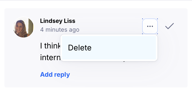 If you need to delete a comment you've left, you can do so by clicking the triple dot menu beside your comment and then clicking Delete as shown below: