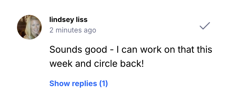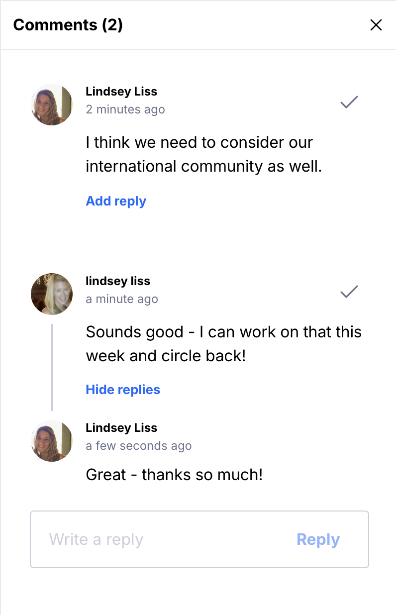 If you want to reply to an existing comment, you can click Reply to bring up a new comment nested beneath the original: