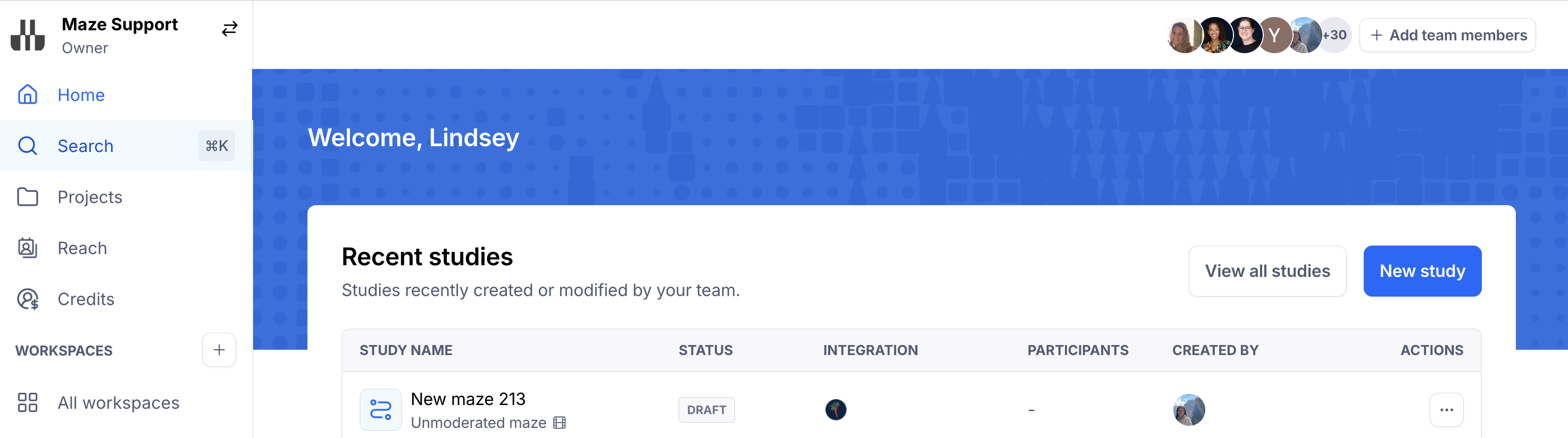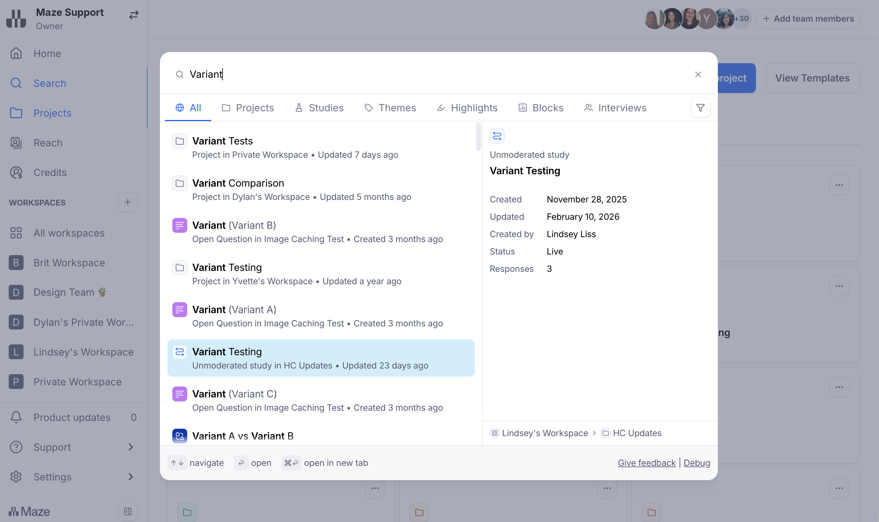 Our global search functionality allows users to search across their entire workspace to find studies, participants, insights and more while saving time, preventing duplication and making your work more discoverable and accessible as you scale your research using Maze.