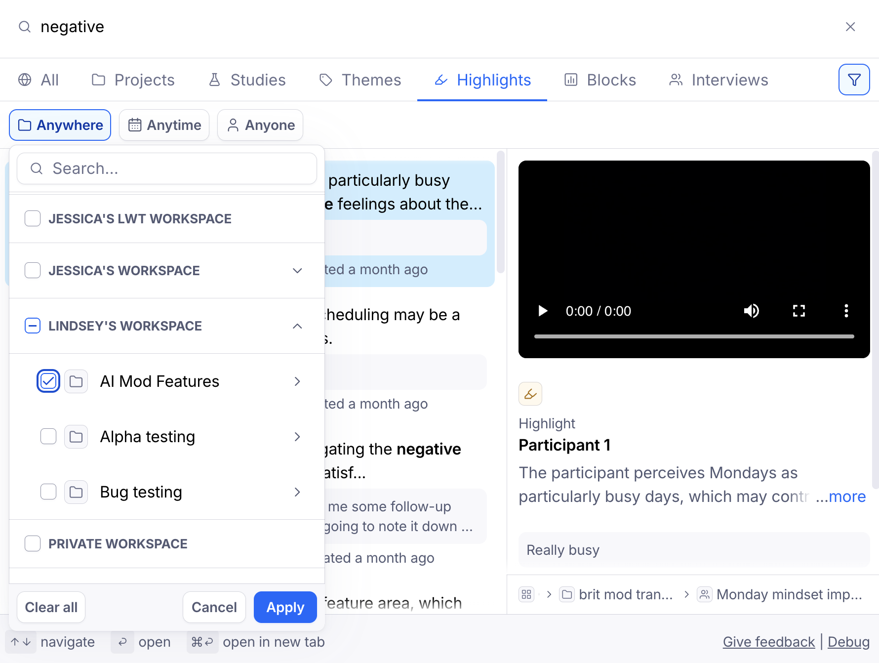Click Search and enter one or more keywords to start searching for a workspace, project, study, theme, or highlight. You can also click the filter icon (far right) to filter by workspace, project, study, a specific time frame or a specific team member.