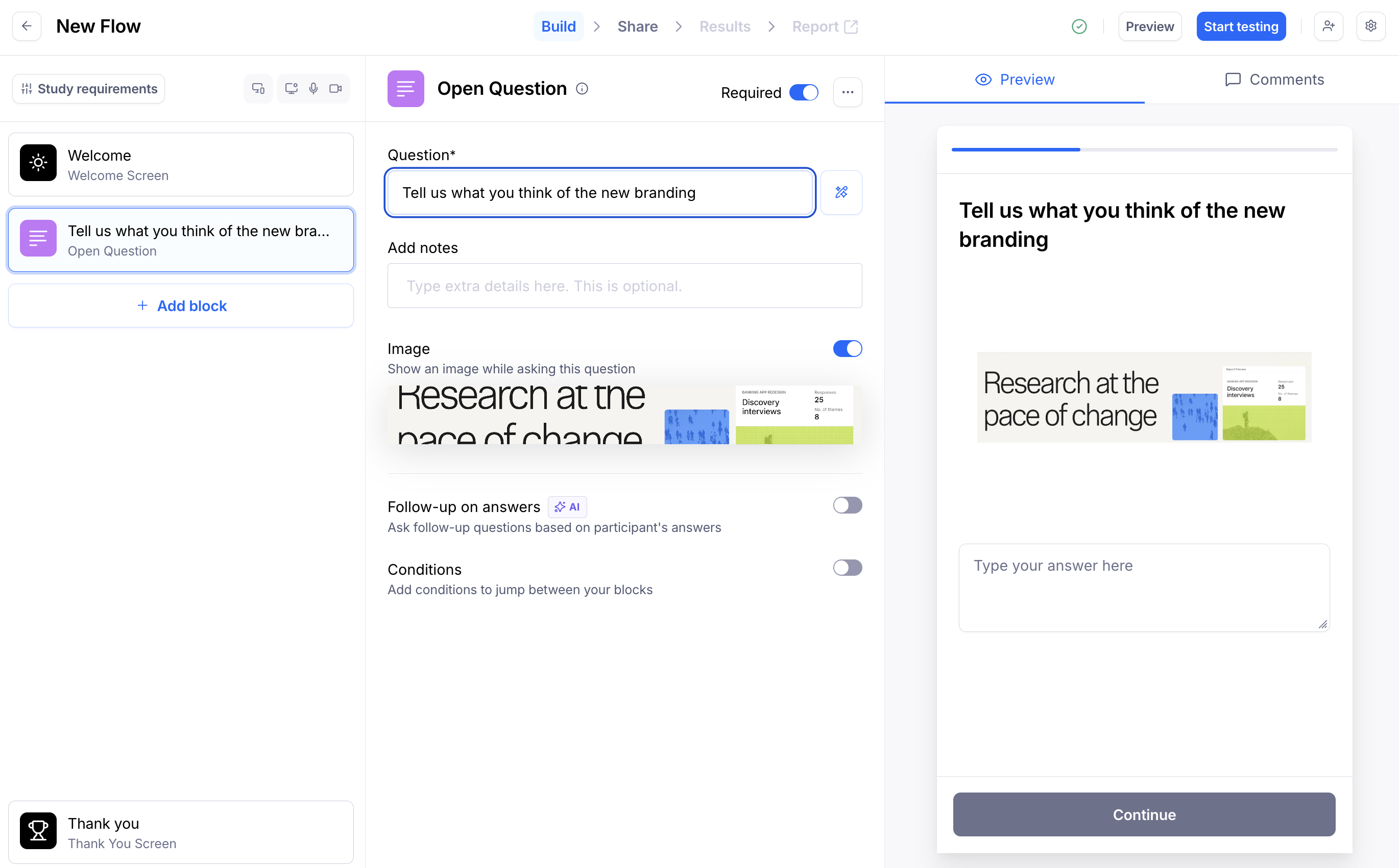 You can easily display images or prototype screens next to a question. This can be helpful to: