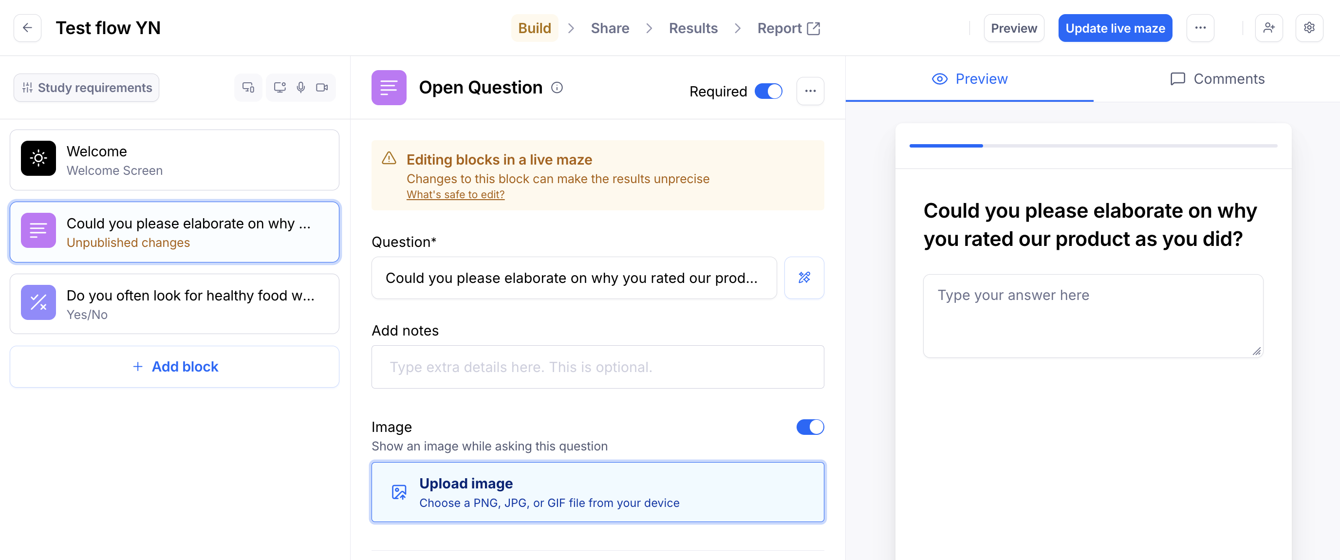 - Upload image: In all cases, you can upload an image from your device. Maze supports GIF, PNG, and JPG files. The maximum image size is 5mb.