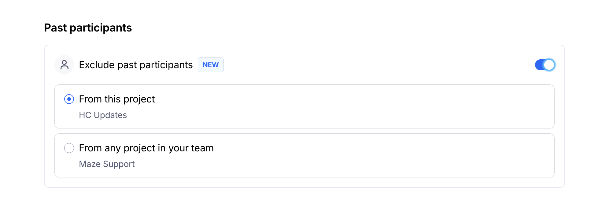 - If you're on the Enterprise plan and would like to exclude past participants, toggle Exclude past participants to on. There are two exclusion options:
