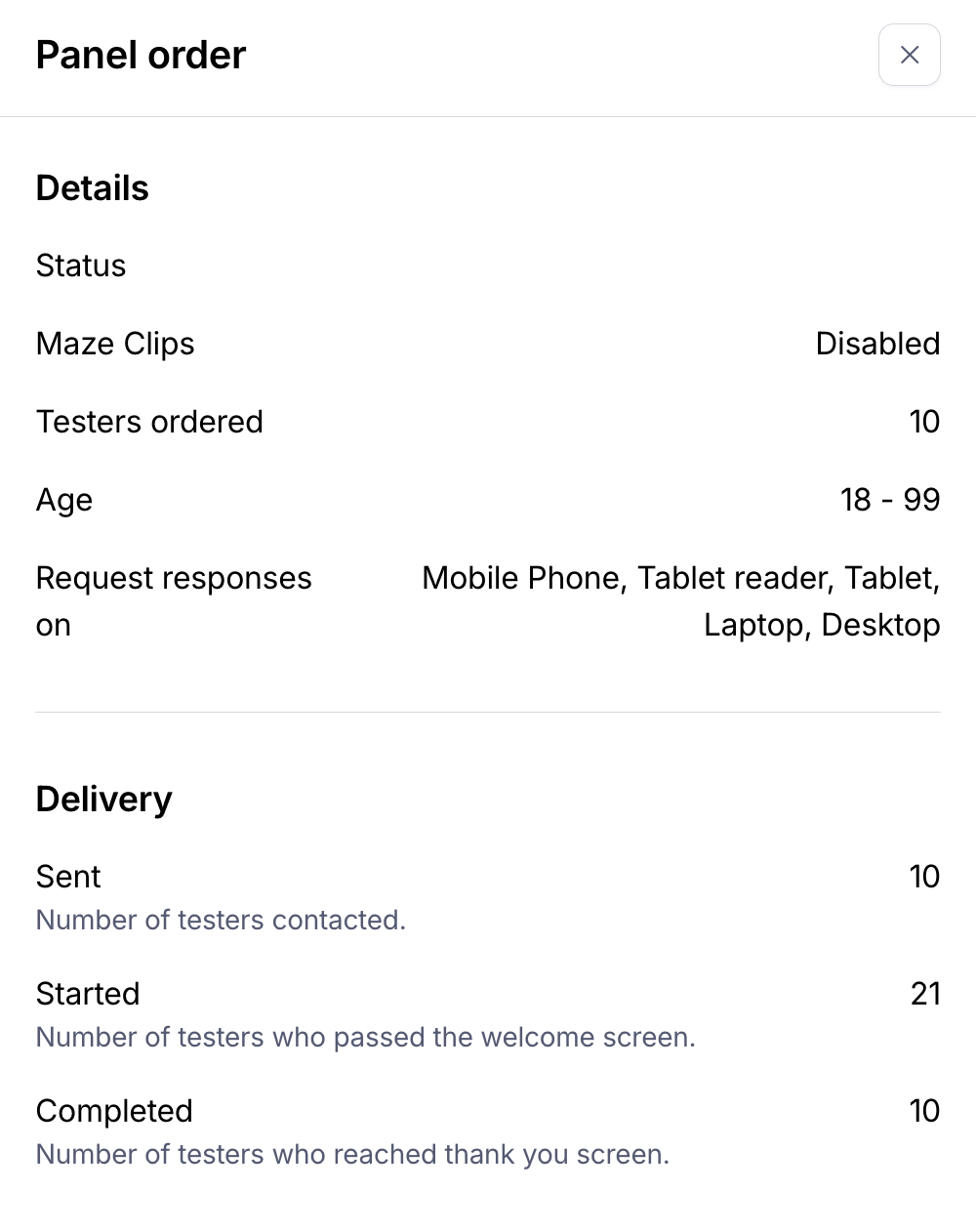 Panel orders don’t stop automatically. They stay active until the number of participants you’ve selected has completed your maze.