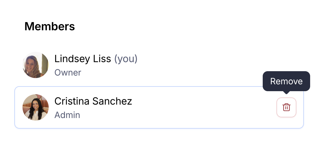 Hover over the name of the member you want to remove in the list of members and click the trash icon to remove.