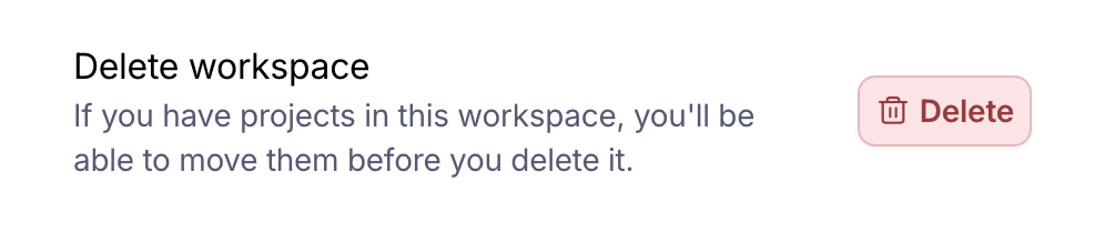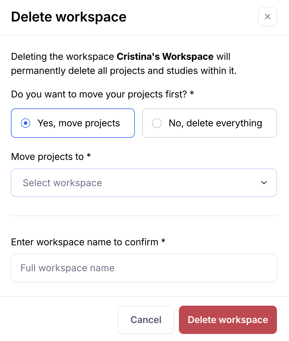 - If there are projects inside the workspace, you’ll have the option to move them. If you don't move them, they'll be permanently deleted alongside the workspace.