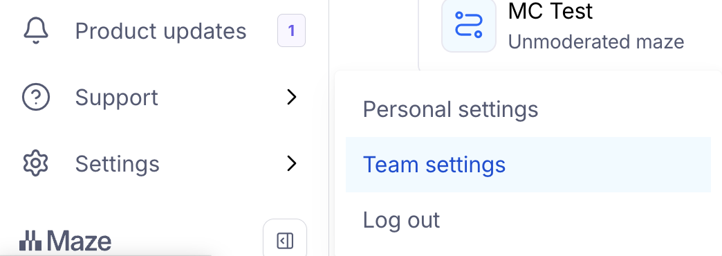 - Log in to your Maze account and ensure the relevant team is selected in the drop-down in the top left corner.