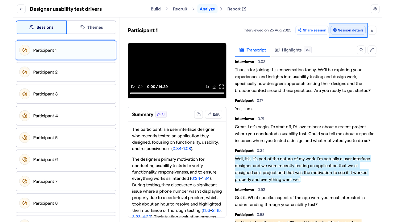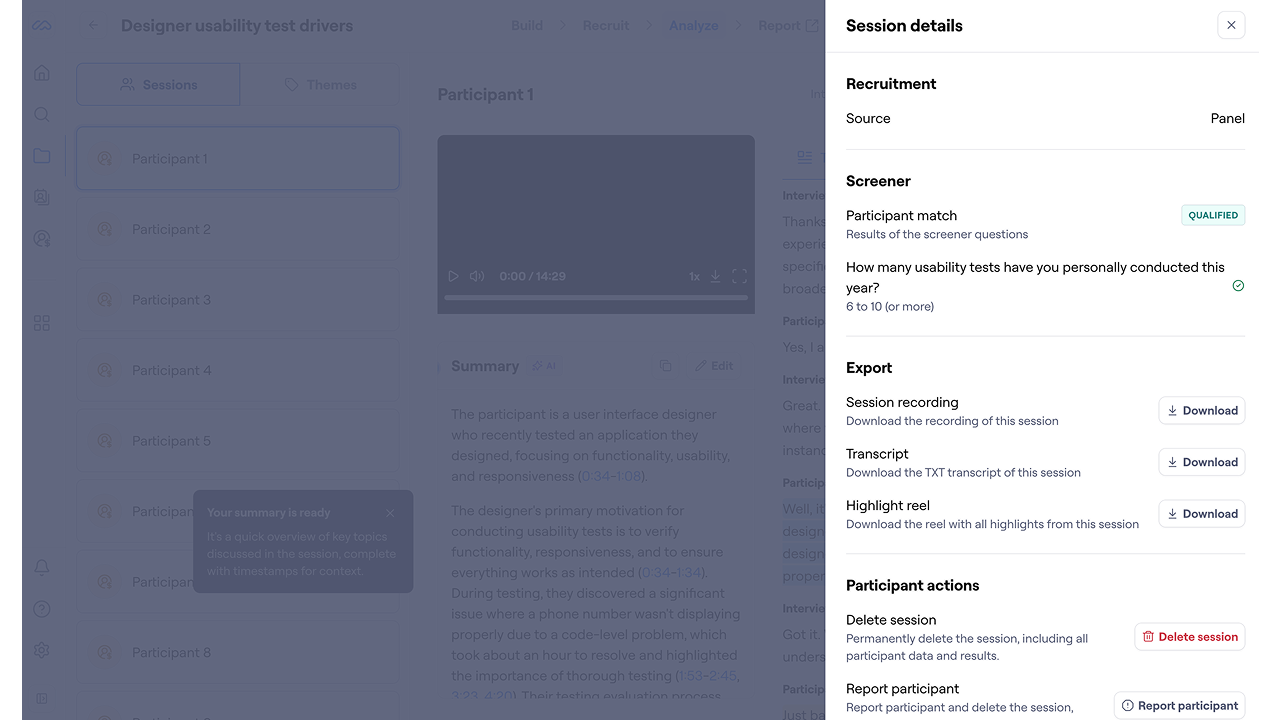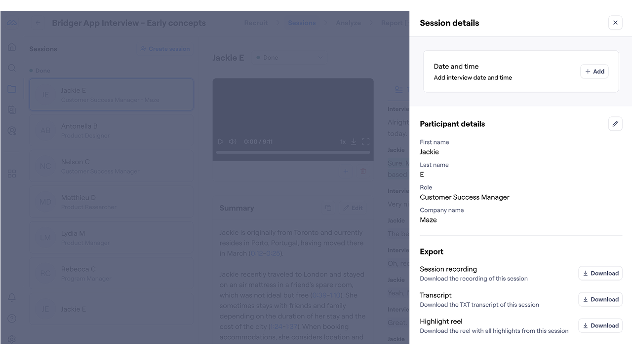 To access all export options for each session for your AI Moderated study, either click Session details or the download icon (next to Session details).
