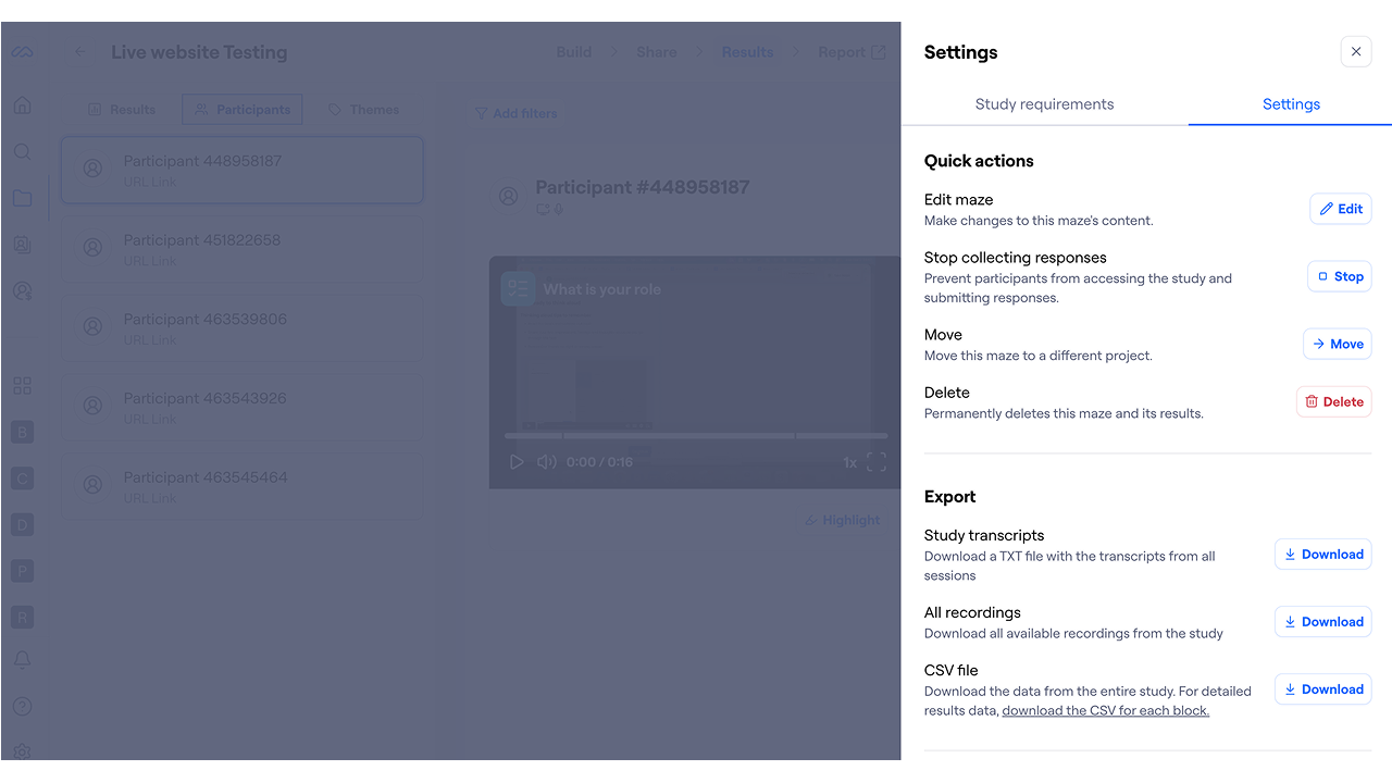 To download all transcripts in the study, navigate to your study settings via the cogwheel icon in the top right side of your screen. Under the Export section, the Study transcripts option will download the txt transcripts from all sessions in this study, instantly.