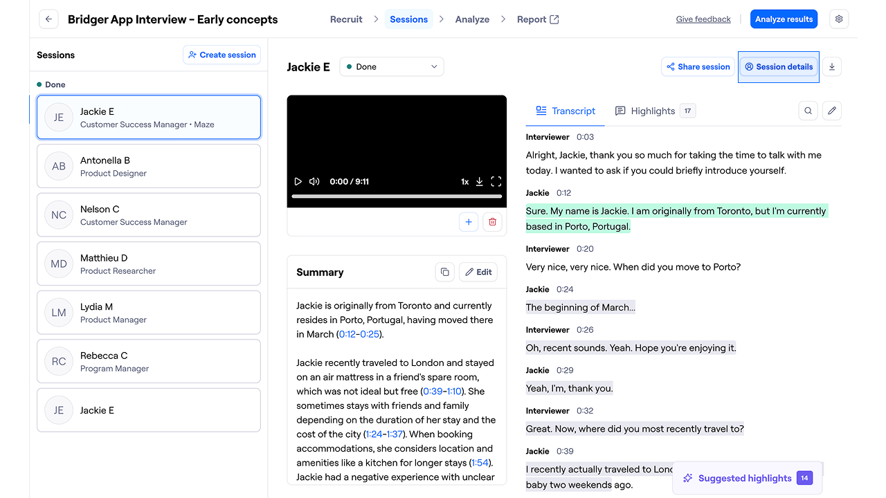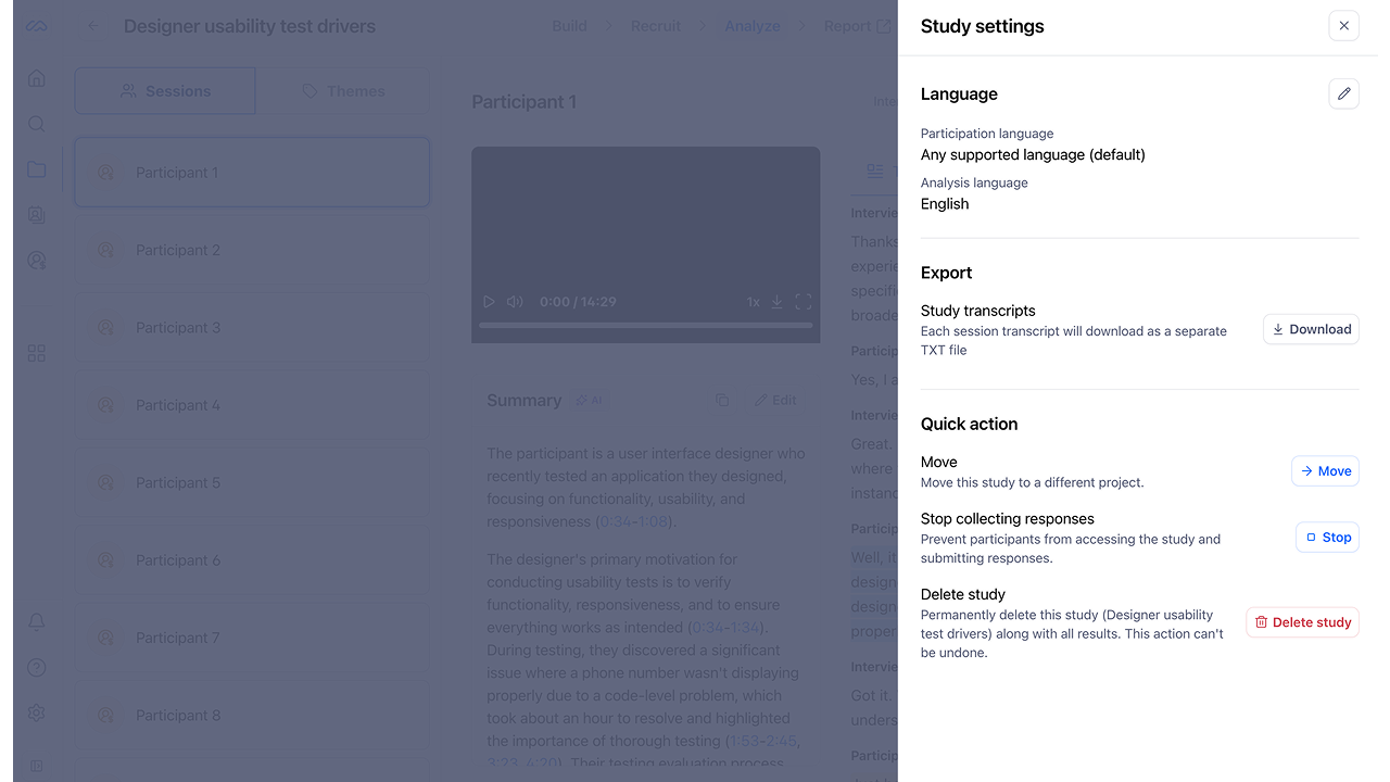 Clips containing audio from unmoderated studies and all sessions from Moderated or AI-Moderated studies are automatically transcribed, streamlining how you review and extract insights from participant conversations.