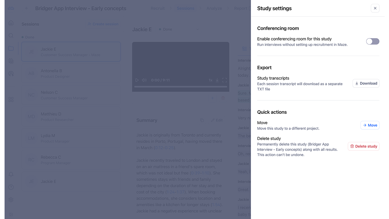 Within study settings via the cogwheel icon in the top right side of your screen, under the Export section, there is a Study transcripts option which downloads the txt transcripts from all sessions in this study, instantly.