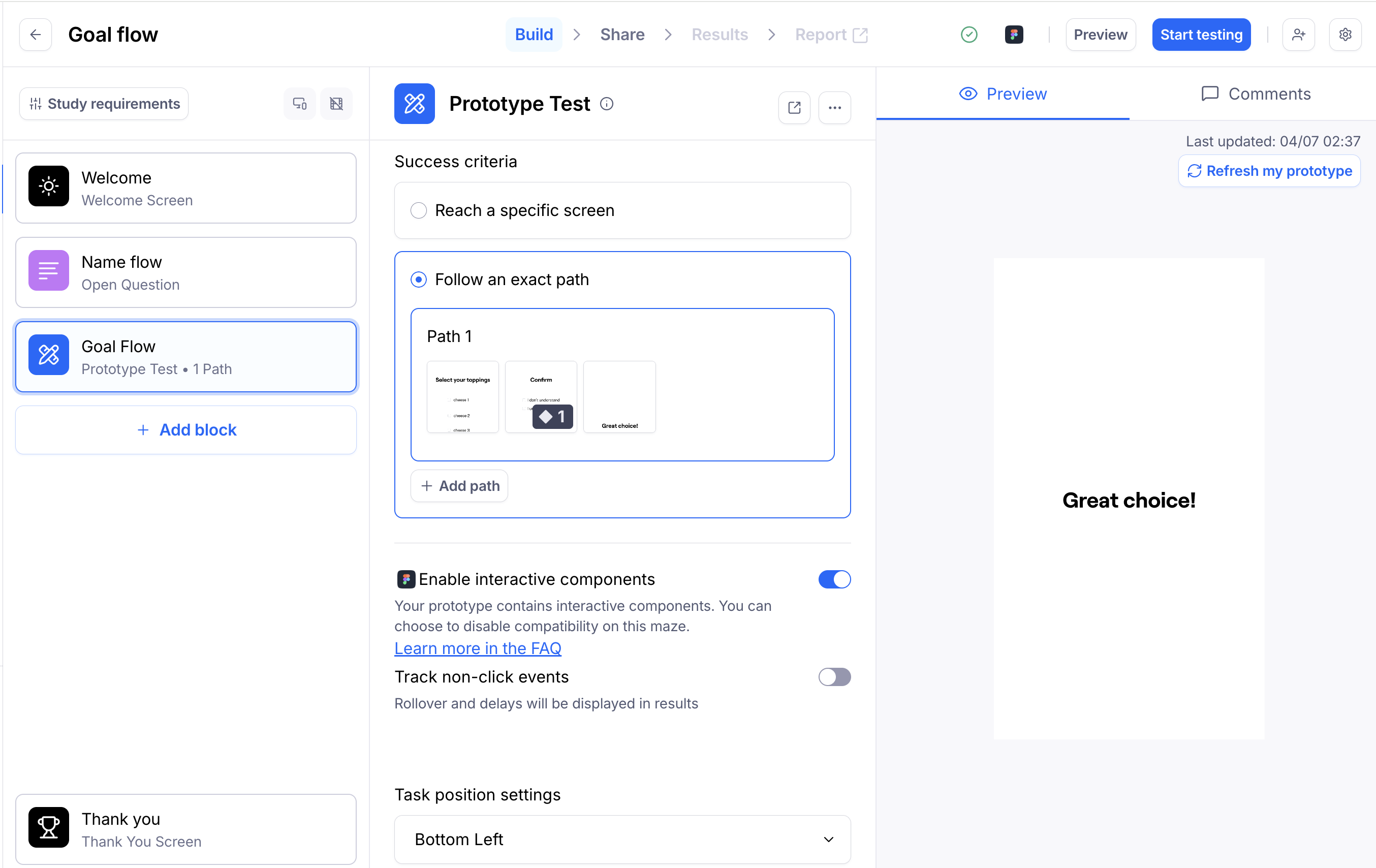 Please note that testers will be able to interact with interactive components in your Figma prototype, regardless of whether or not you've enabled this feature on the maze. But if you need these interactions to appear in the path analysis, you'll need to enable the interactive components feature.