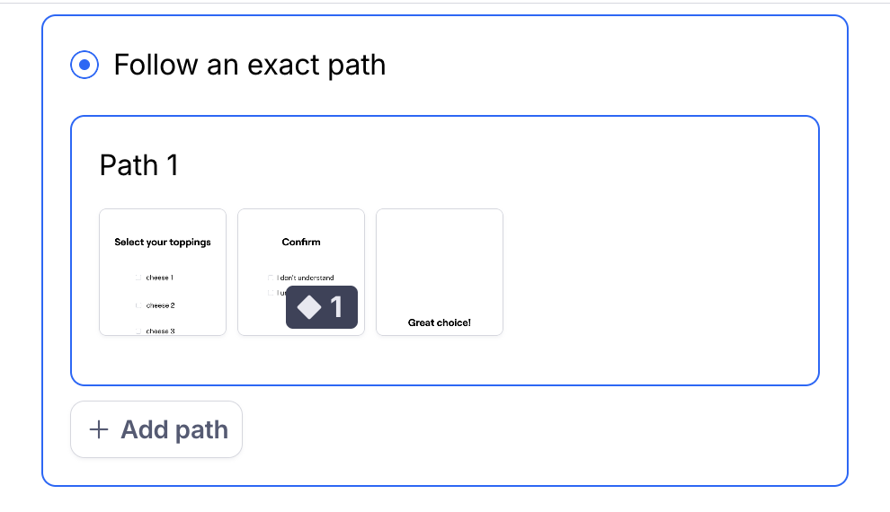 Set the expected path(s). Any state changes you make to an interactive component (e.g. checking and unchecking a checkbox) via “change to” interactions will be shown in the expected path with an icon and count on the respective screen thumbnail. Pay close attention to the end states of the screens, as these will impact how success is measured. How do interactive components work with results and reporting in Maze?