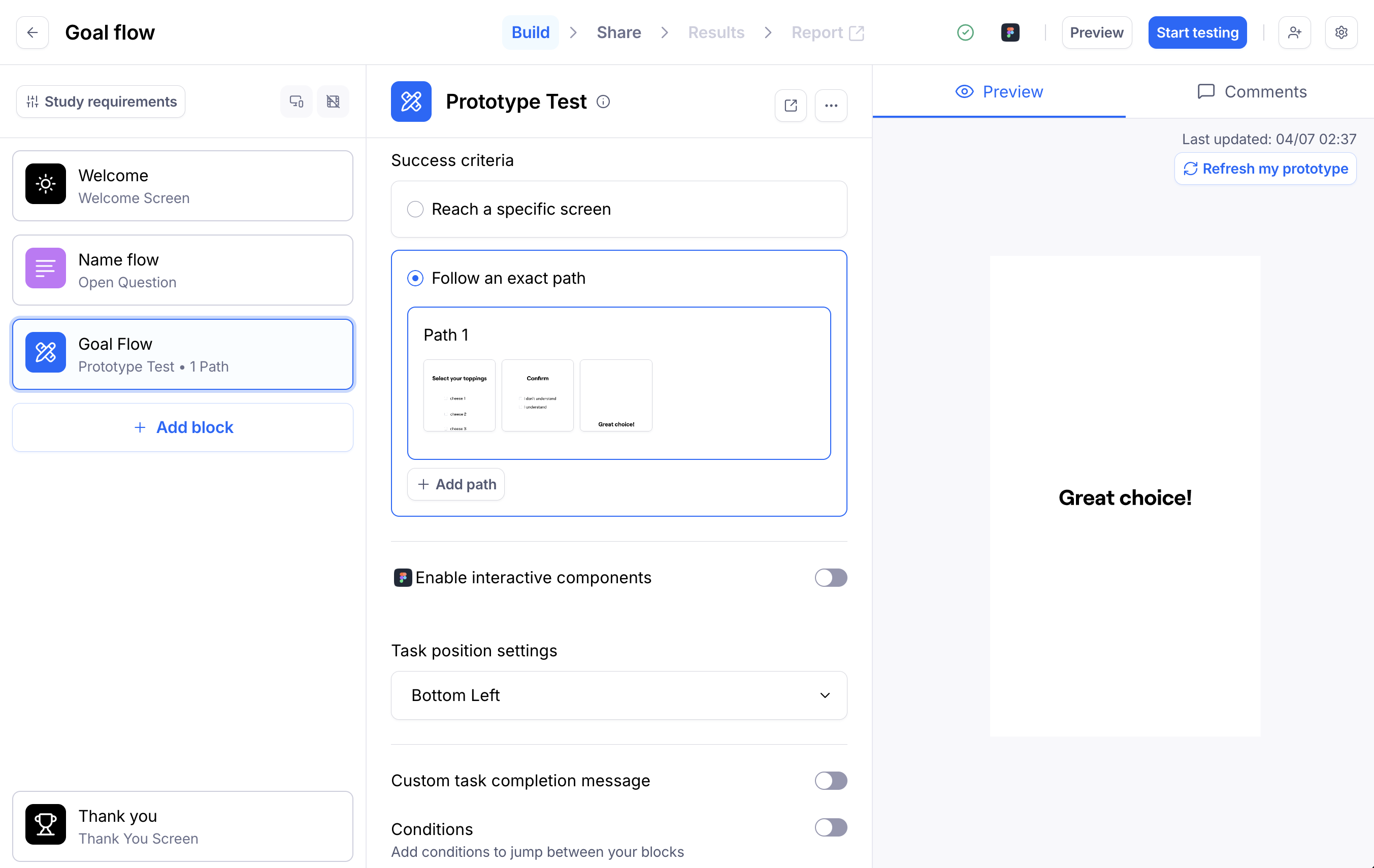 Enable the toggle Enable interactive components to allow “change to” interactions involving component variants (e.g. enabling/disabling a toggle) to be captured in your expected path. Note that this toggle only appears if interactive components are detected in the Figma prototype.