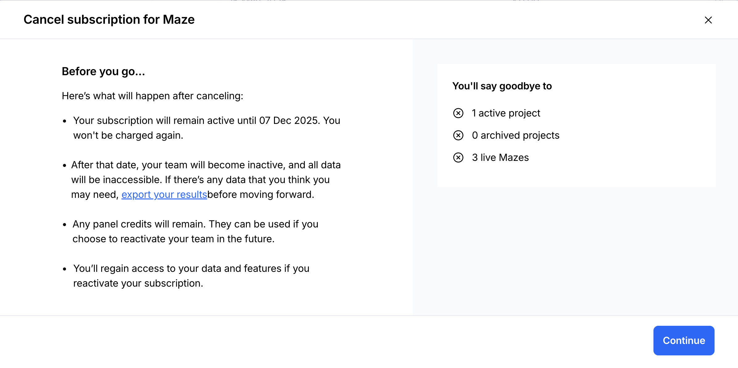- After the cancellation, your team will become inactive, and all data inaccessible. If you have any data in your projects that you think you may need, please export your results data before canceling.