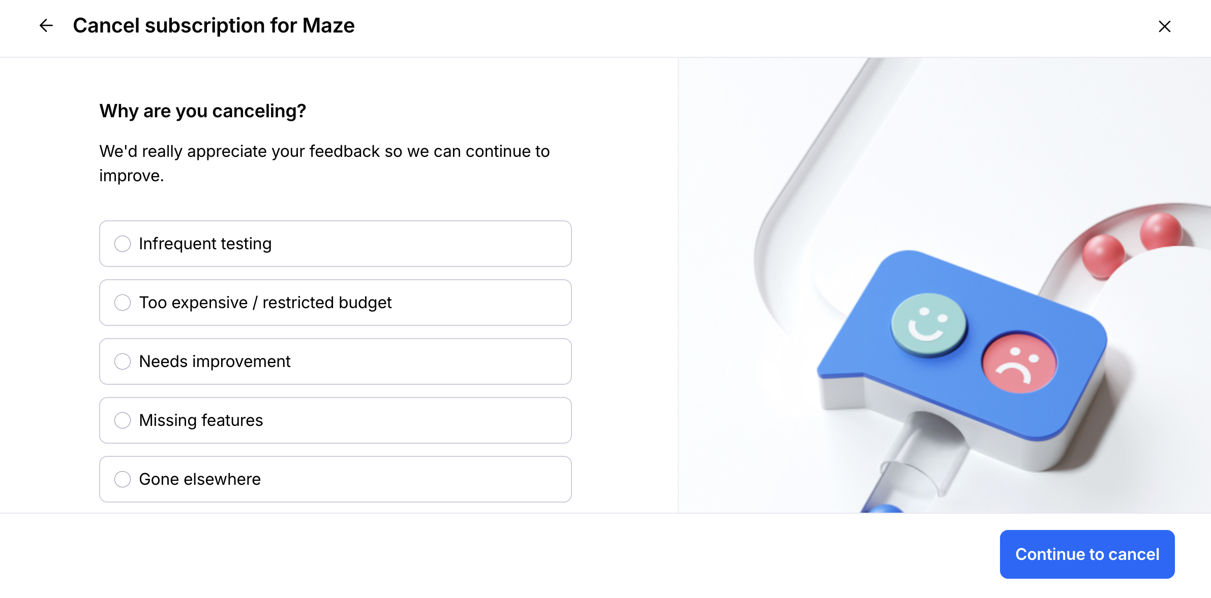 All Maze subscriptions renew automatically, either monthly or annually, depending on the billing option you selected when upgrading.