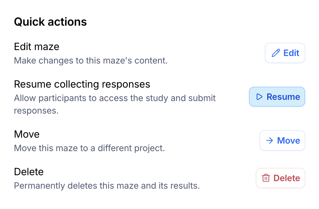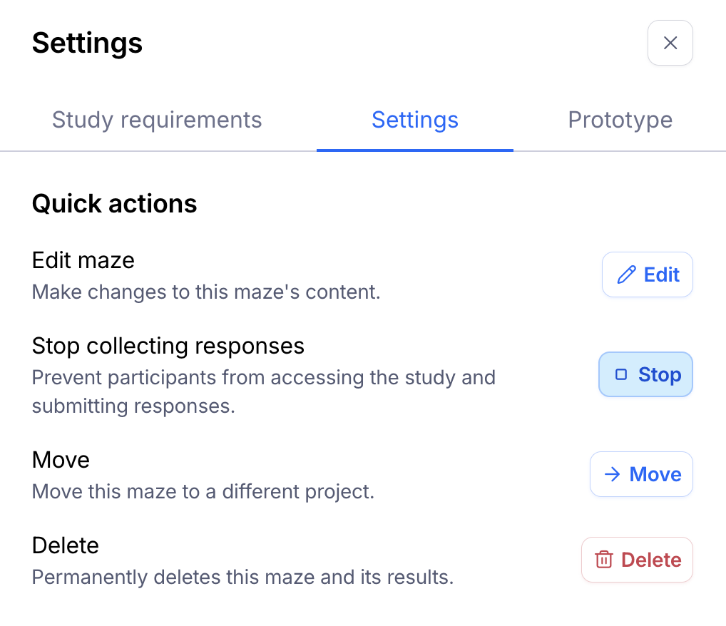 Stop participants’ access to the maze once you’ve finished testing, or hit the limit of participants you want to test with. This option also comes in handy if you need to temporarily suspend testing while you analyze the results.