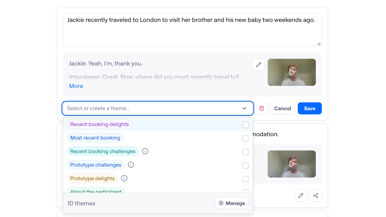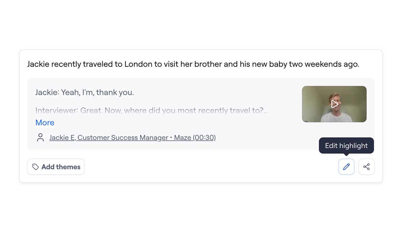 You can add highlights within a theme to a highlight reel to showcase key moments, feedback, and quotes across multiple interviews. Theme highlight reels make it easy to spot patterns within a theme and share insights with your team.
