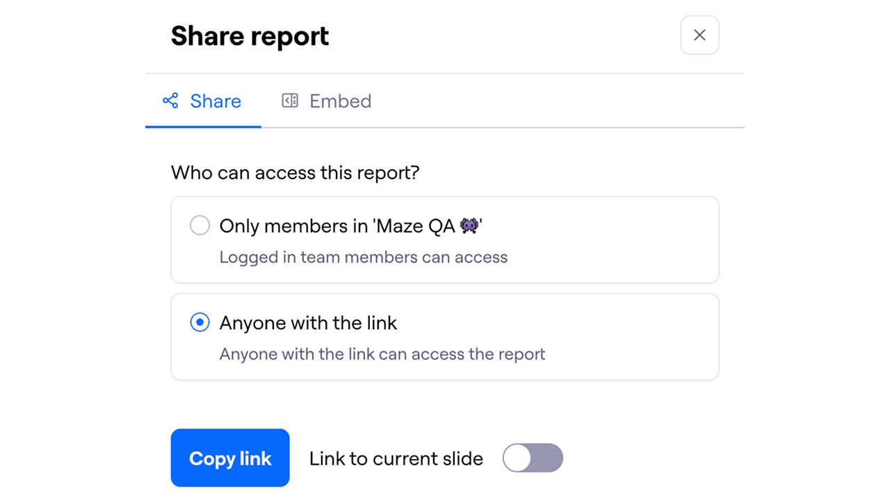 Users can share the report or a specific slide with stakeholders. Open the report and click Share report to copy the share link. You can also copy the embed link to view the report in your tool of choice.