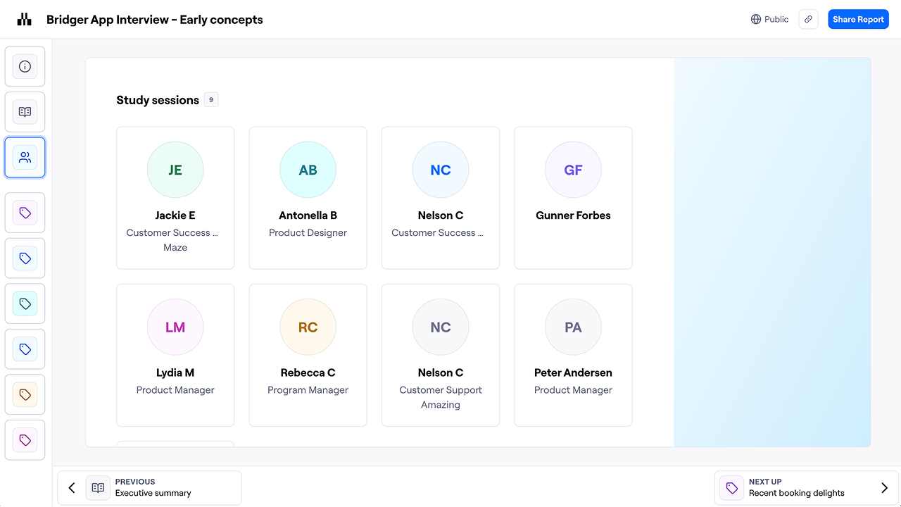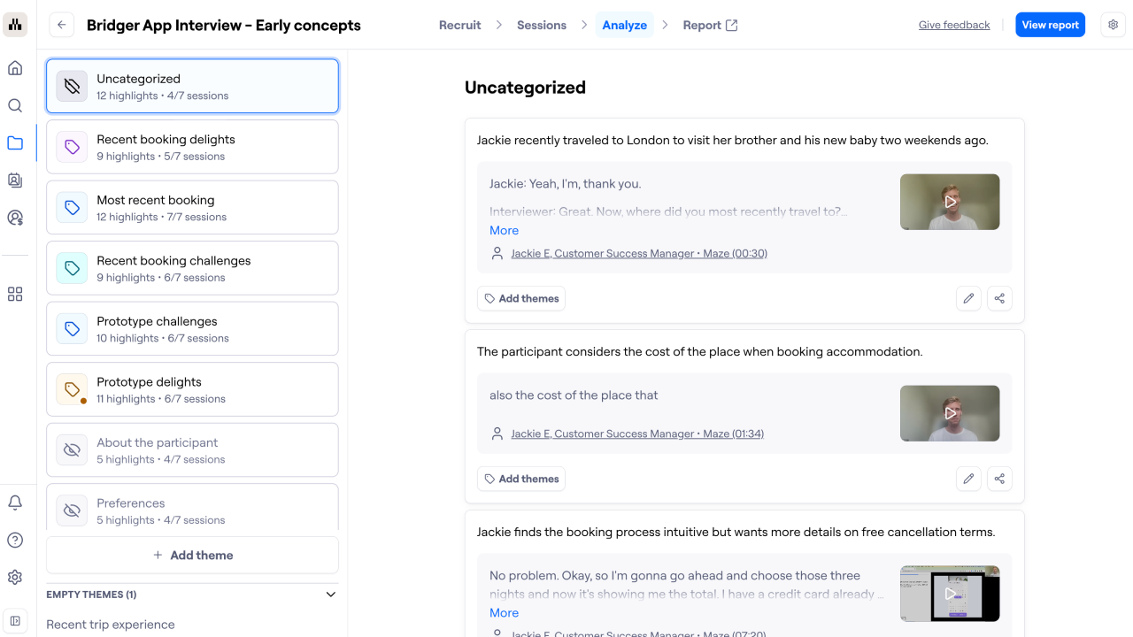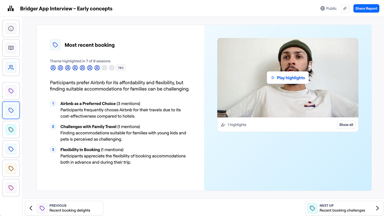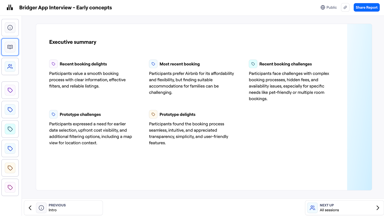 The interview report is a presentation that provides an overview of each theme and its associated highlights, as well as an overview of each session. Reports make it easy to share and present your findings.