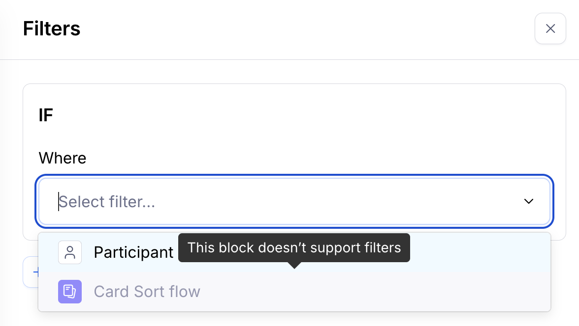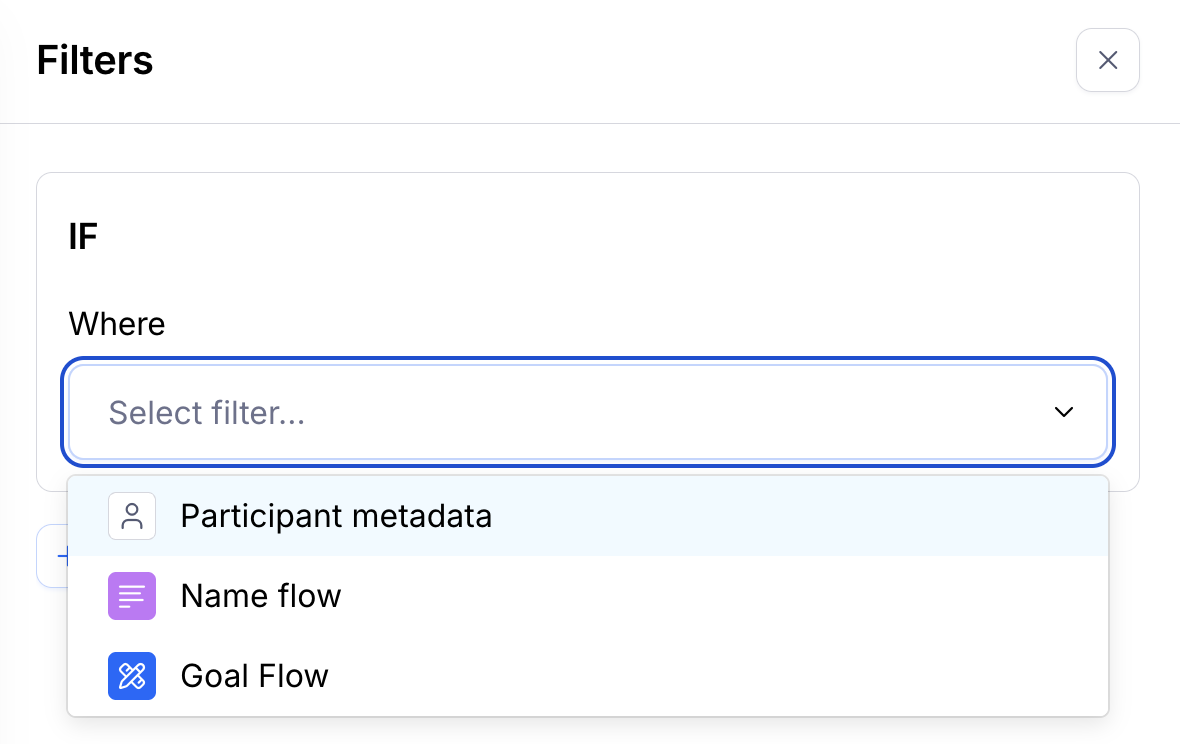 - Select either ‘Participant metadata’ or a block in the Where field. Please note that certain block types can’t be used to filter by outcome. Learn more