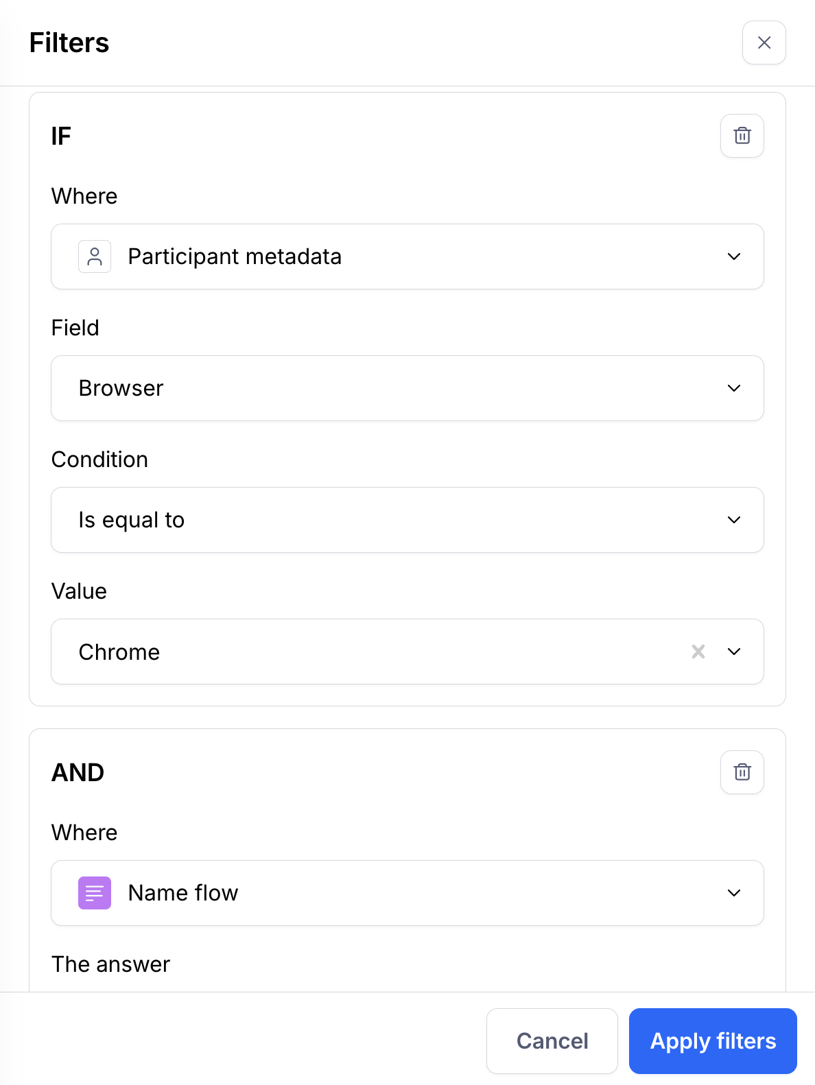 You can filter by participant metadata or by block answer/outcome.