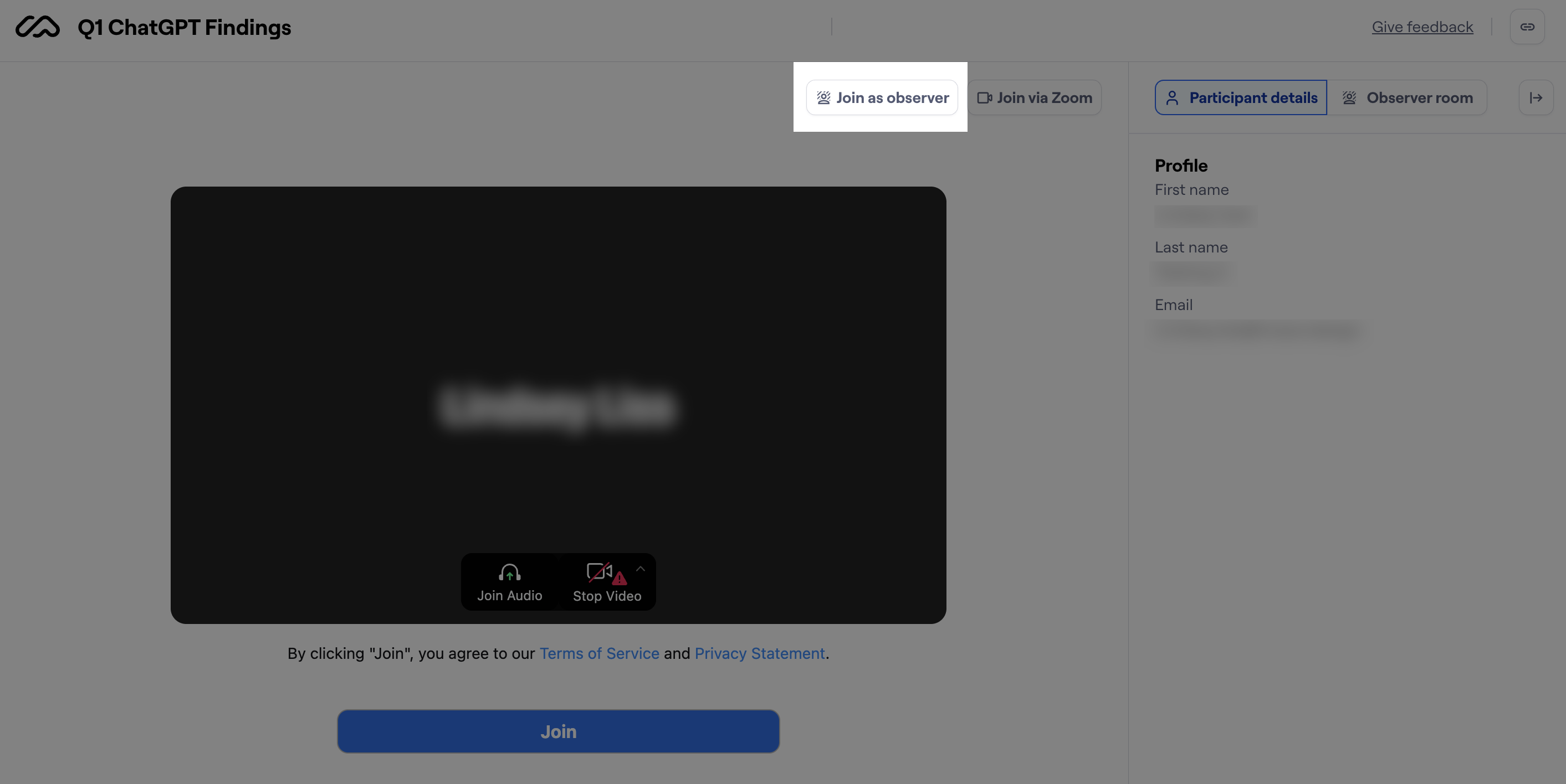 If you've used the main conferencing link to join the interview session, simply click the Join as observer button (top right corner of your session screen) to ensure you're in observer mode.