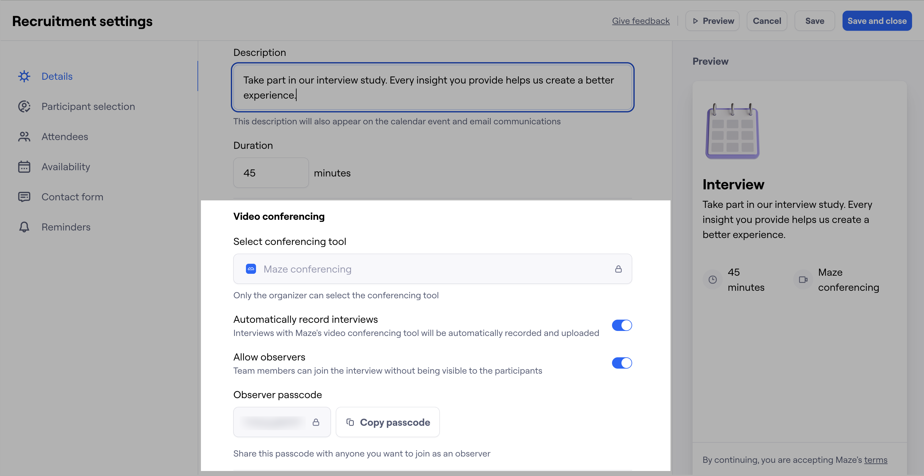 To get started, create or navigate to an Interview Study. From the Recruit tab, select Recruitment settings and choose Maze conferencing.