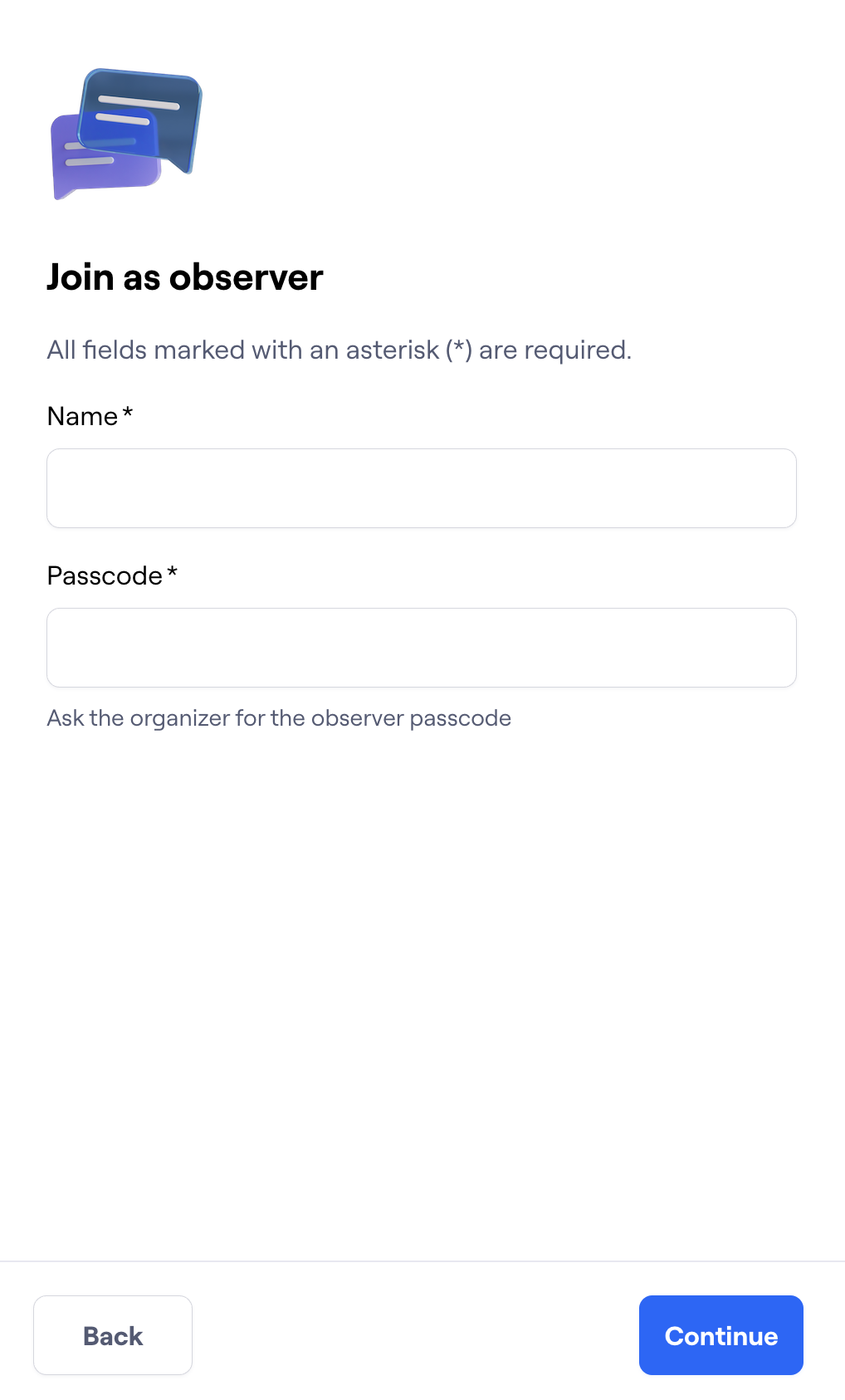 If you've received a calendar invite for an interview and you'd like to join as an observer, simply click the link in your calendar invite and request the observer passcode from the interview organizer/host. Then enter your details as well as the passcode and press Continue. You will then enter the live interview session.