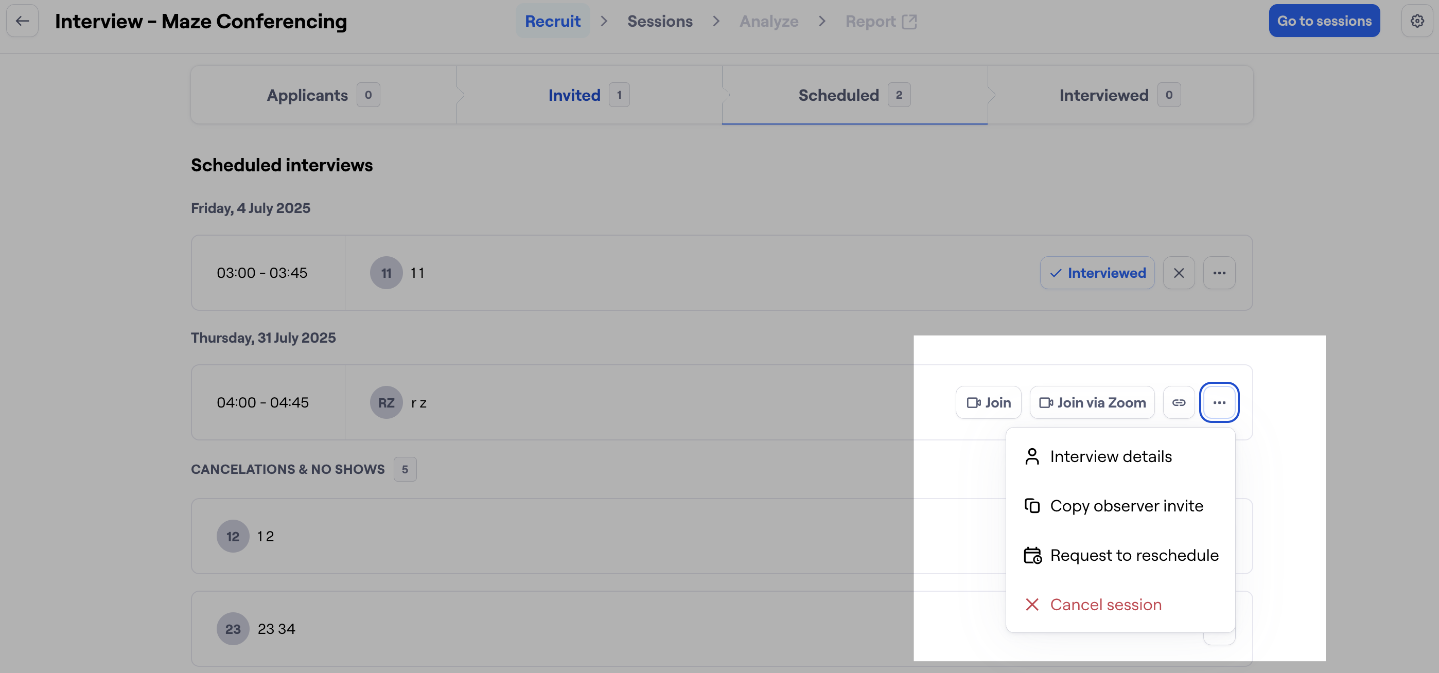 Recruit participants as usual. On the Recruit page, click the ellipsis (⋯) next to a scheduled session and copy the observer invite to share the unique conferencing link and passcode with stakeholders prior to the interview.