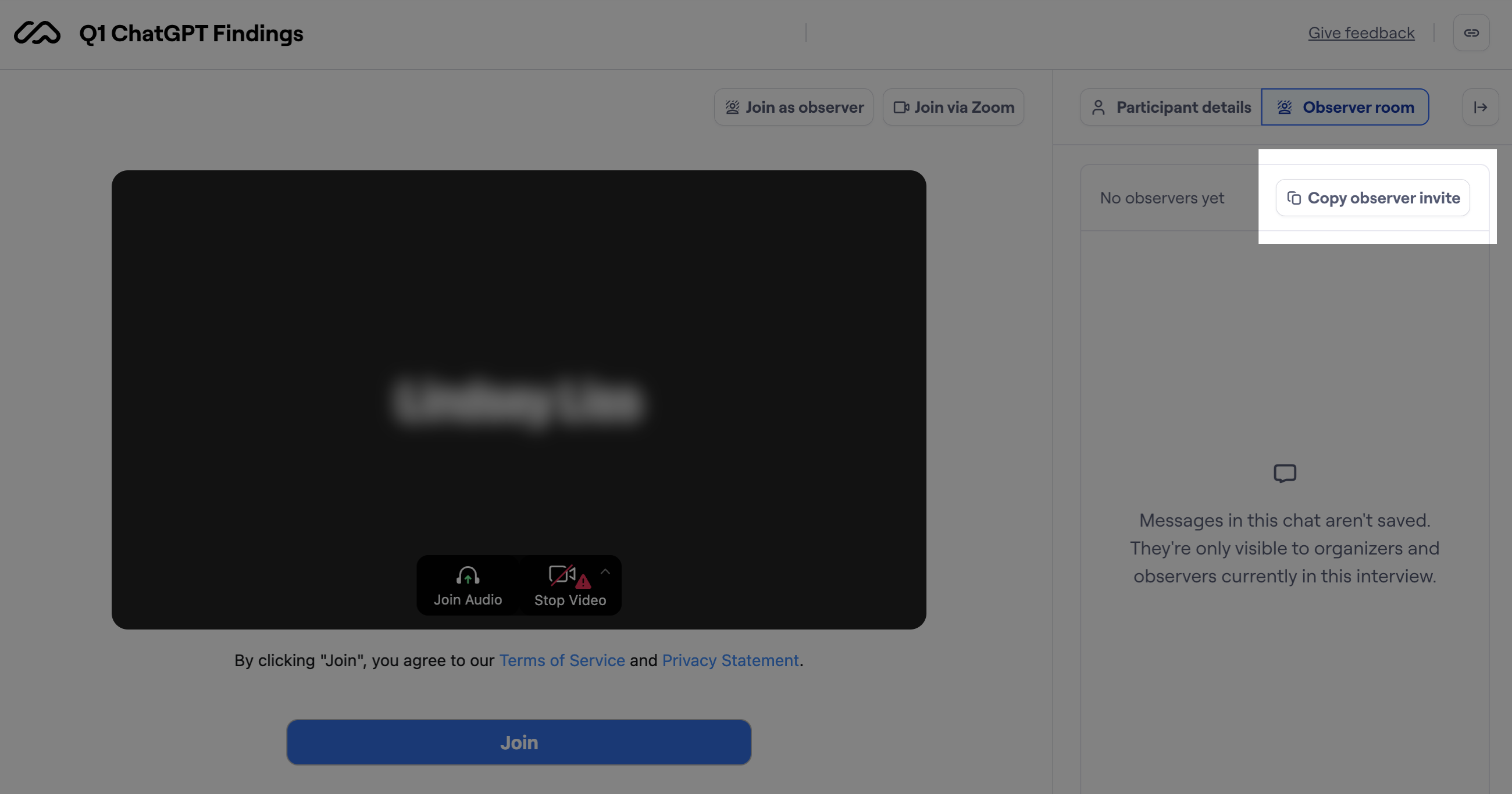 If you find yourself already in the interview and needing to add an observer last minute, you can easily grab the observer invite via the Copy observer invite button (far right).