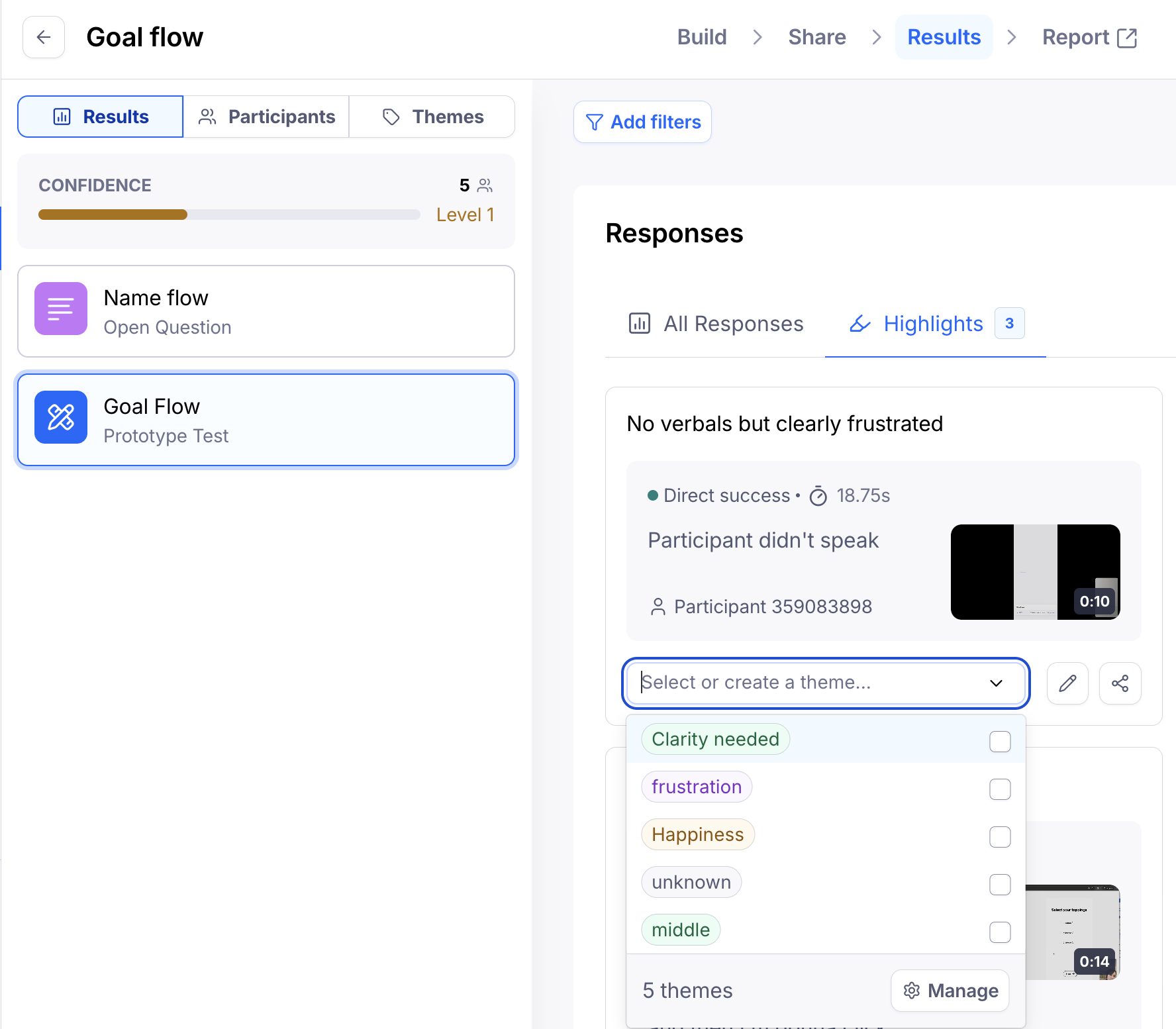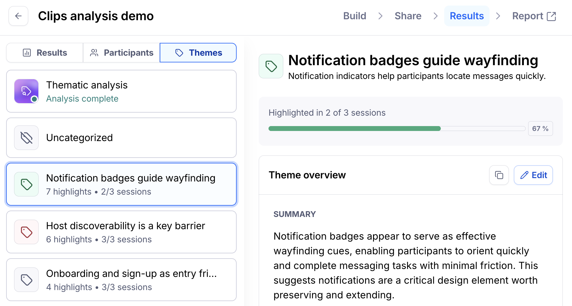 Thematic analysis automatically identifies patterns and insights across all participant sessions within your unmoderated study, transforming individual participant feedback into comprehensive, actionable themes. This powerful feature analyzes your clips to surface key topics, sentiment trends, and findings that help you understand the bigger picture from your research.