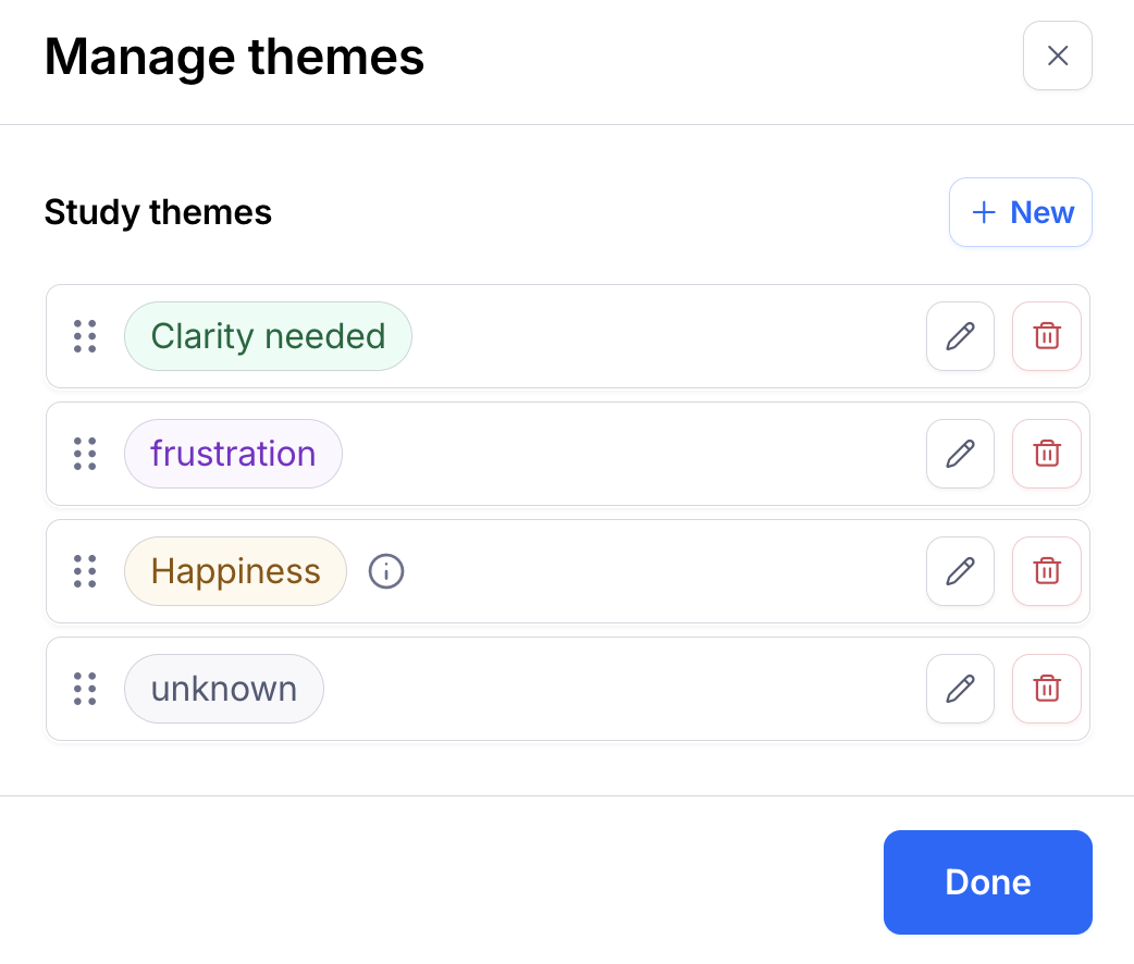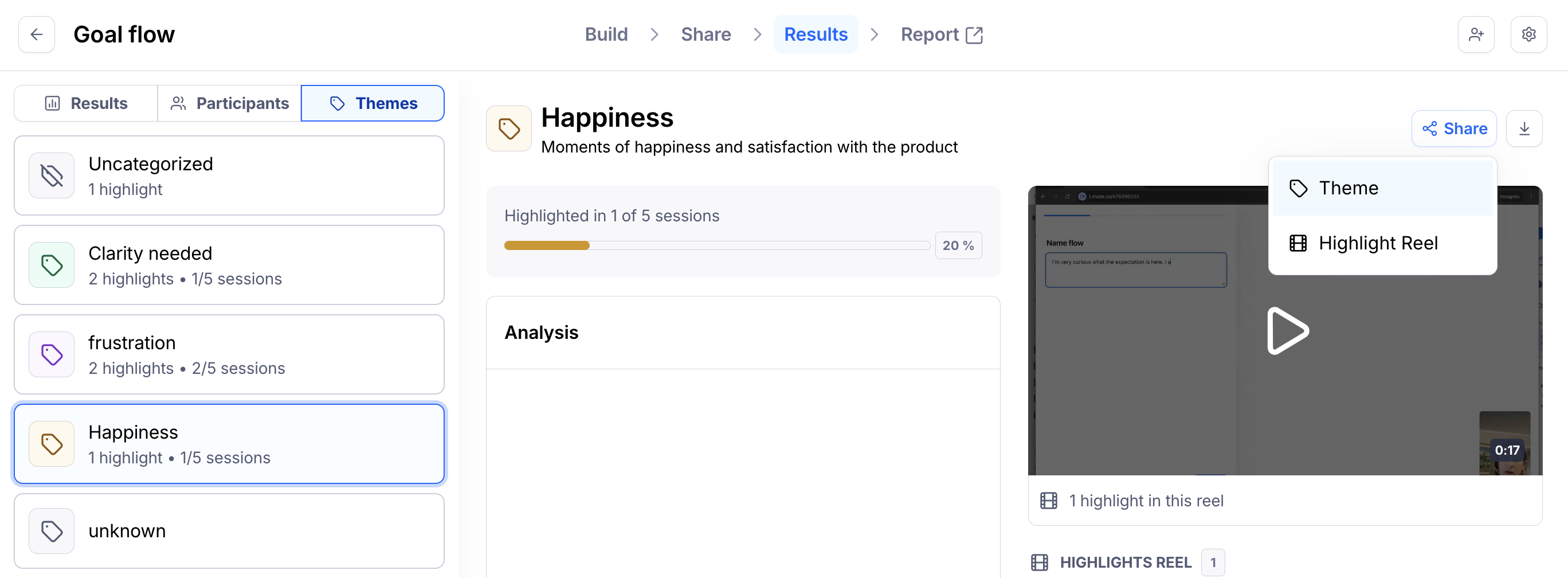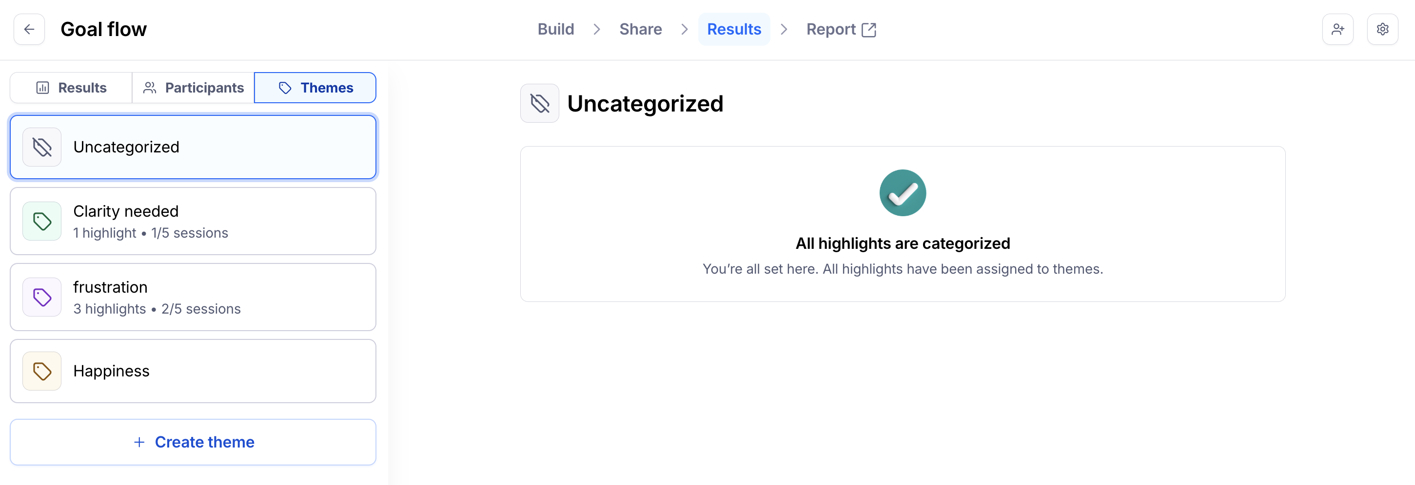 Themes are thematic collections that group related highlights. A theme consists of a title, description, color, summary, linked highlights, and a reel. Themes enable you to organize insights across multiple participants, identify patterns, quantify which issues matter most, and gain a valuable end-to-end experience from analysis to insights.