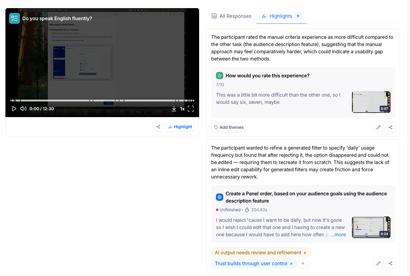 AI-generated highlights appear in the Highlights tab for each participant session. You can review, edit, or delete them — a delete button is available on any AI-generated highlight, letting you remove highlights that aren't relevant to your analysis.