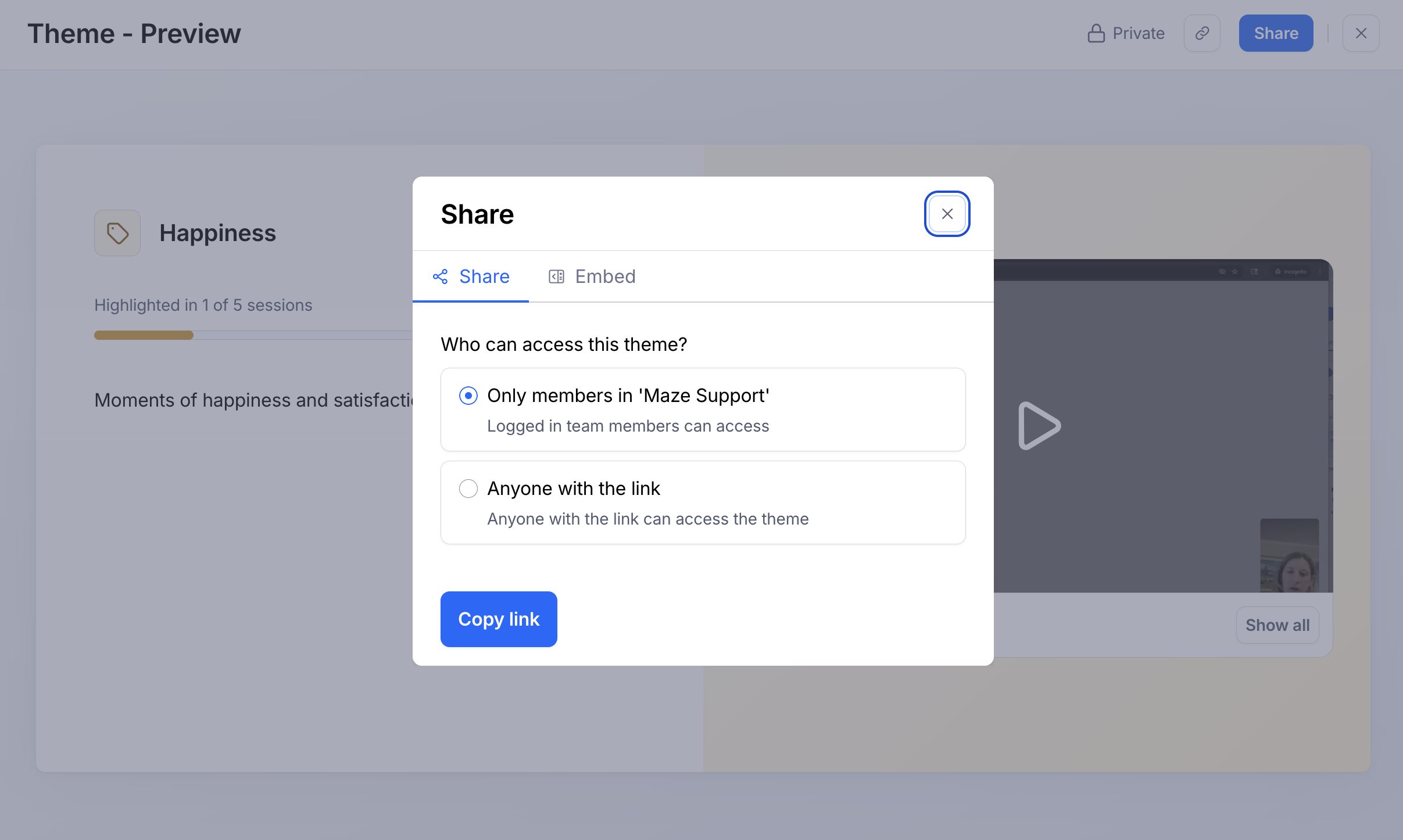 Pasting the share link into a new tab opens a report-like view of the highlight alongside the clip. This allows stakeholders to quickly read the theme's key takeaways and watch the supporting highlights, preserving full context and integrating your insights.